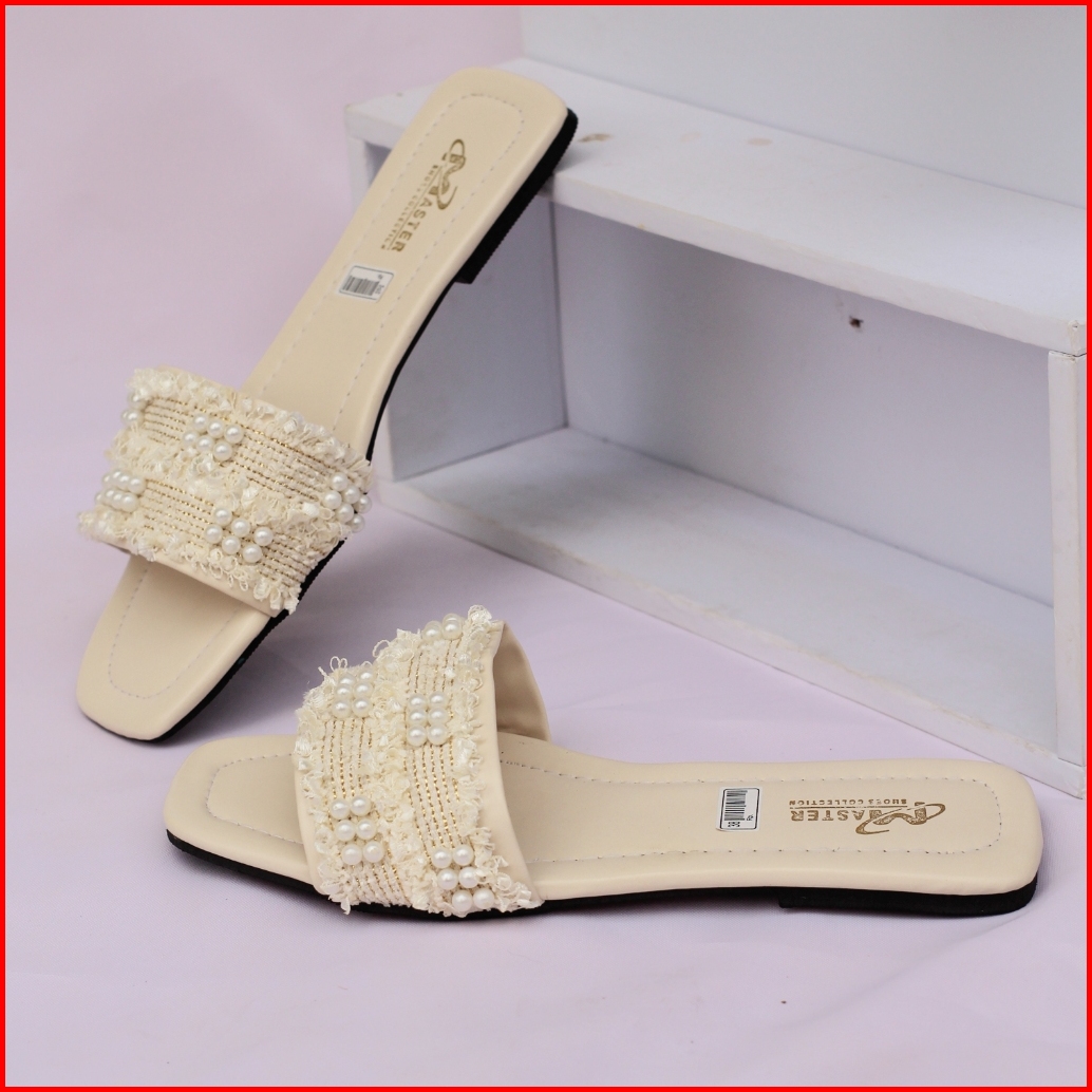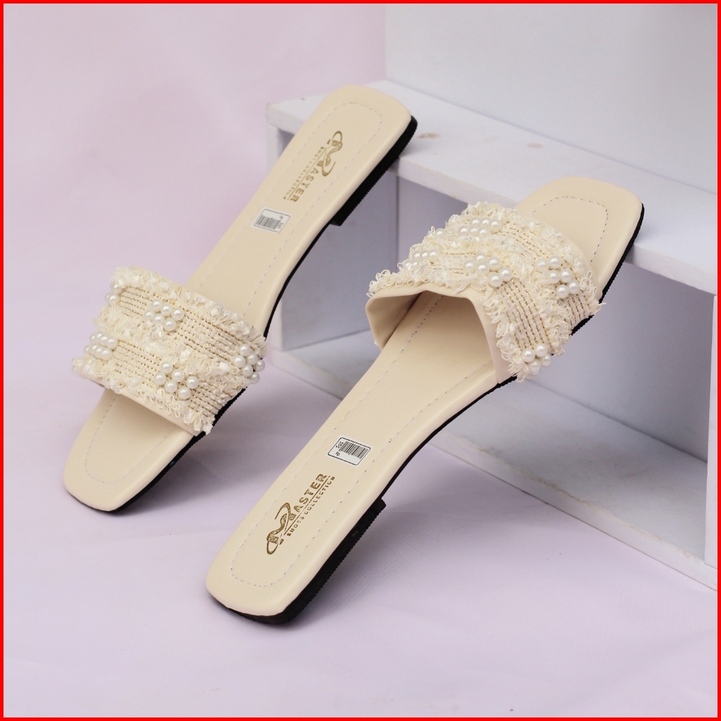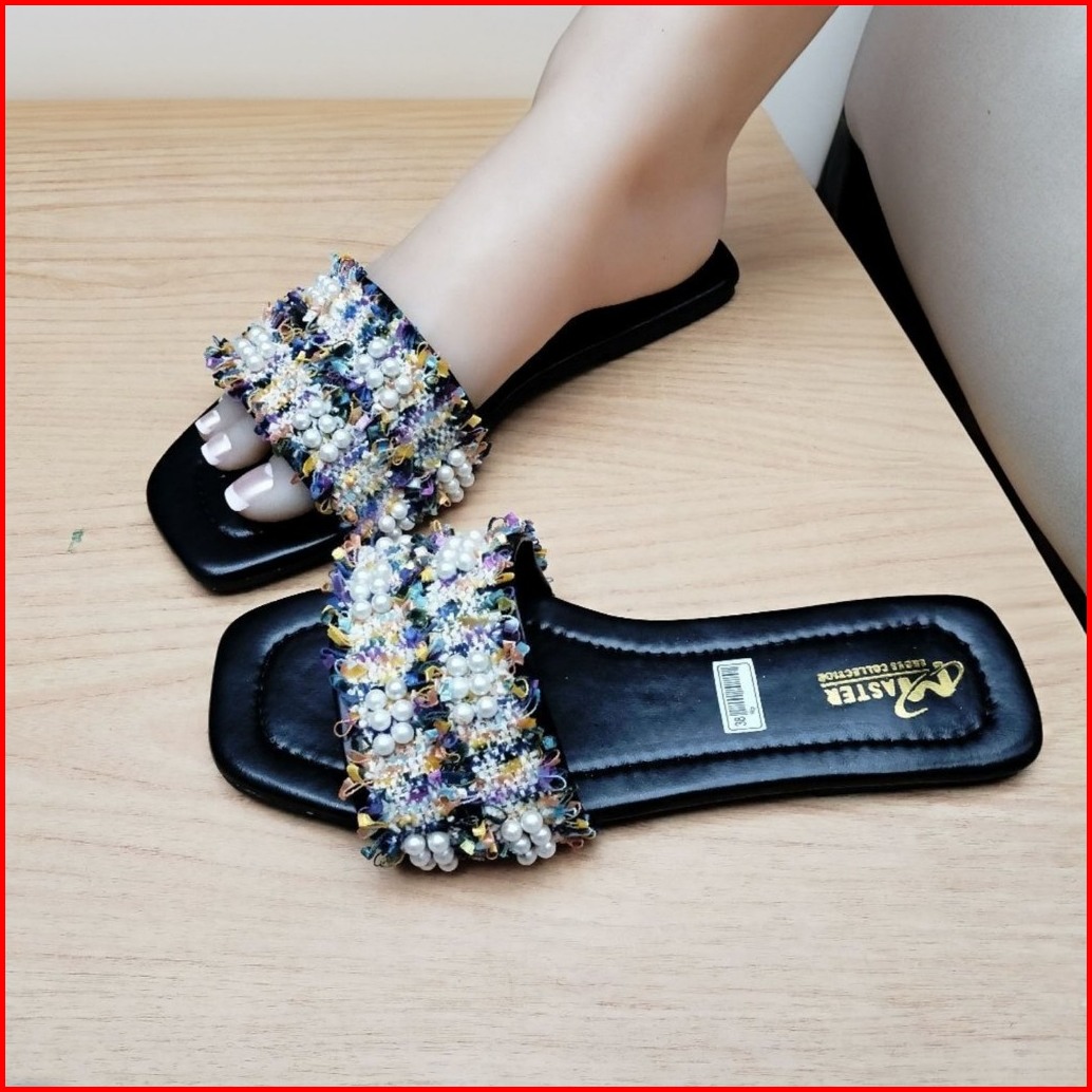 Sandal Slop Slip On Flat Teplek Wanita Variasi Mutiara Kriting Terbaru Modis Kekinian Sendal Kteplek Flip Flop Selop Cas