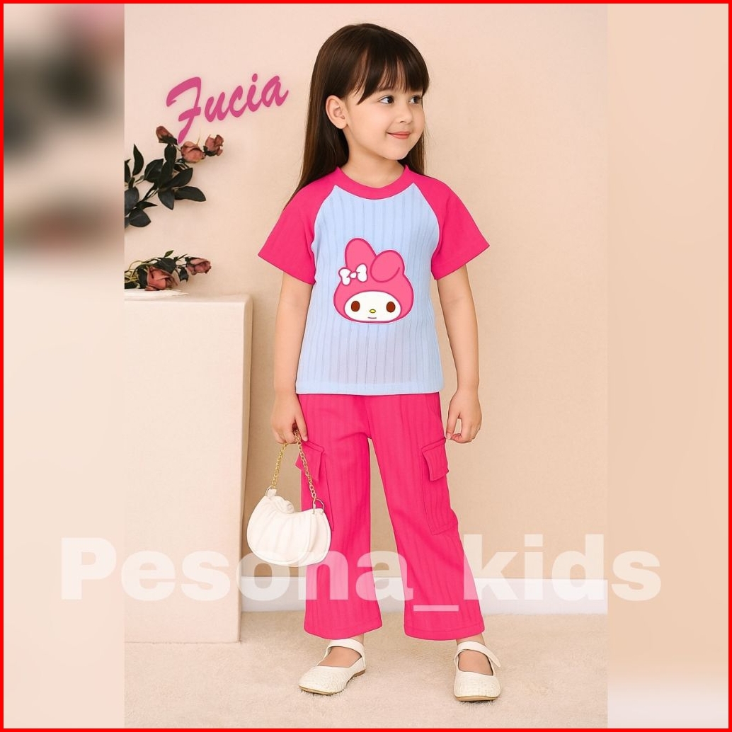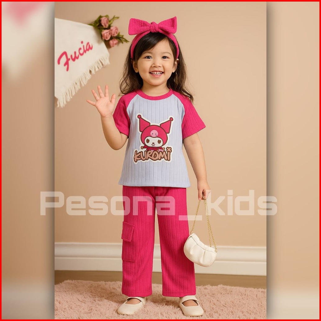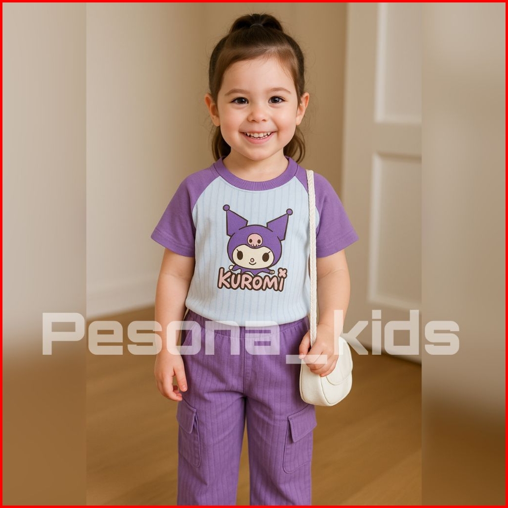 Setelan Kuromi Anak Perempuan Celana Cargo Bahan Knit 1-10 Tahun