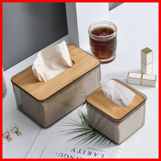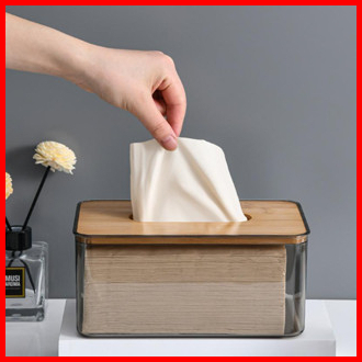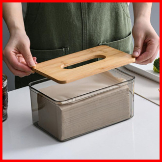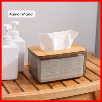 Kotak Box Tisu Wadah Tissue Transparan Bening Plastik Akrilik Tutup Kayu Bambu Estetik Minimalis Persegi Panjang