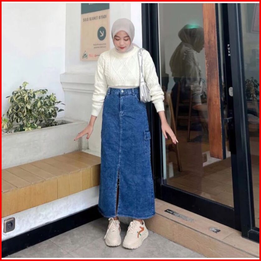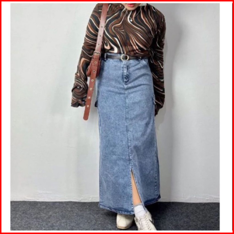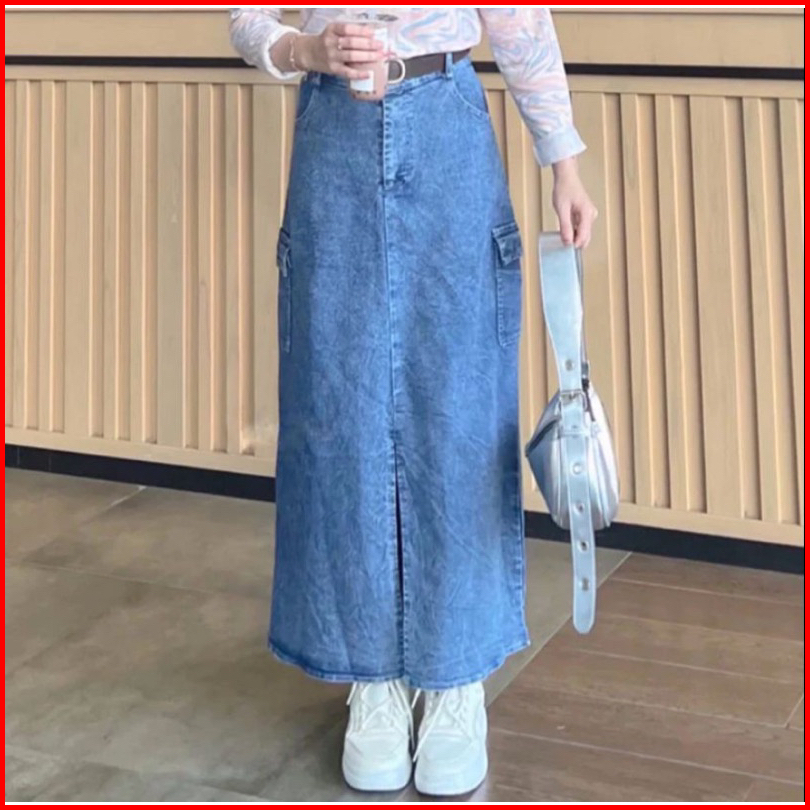 Rok Jeans Cargo Skirt Panjang Wanita Belah Depan