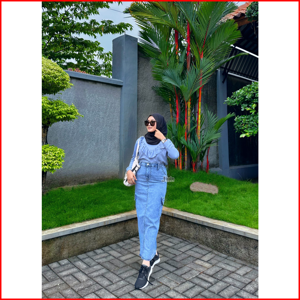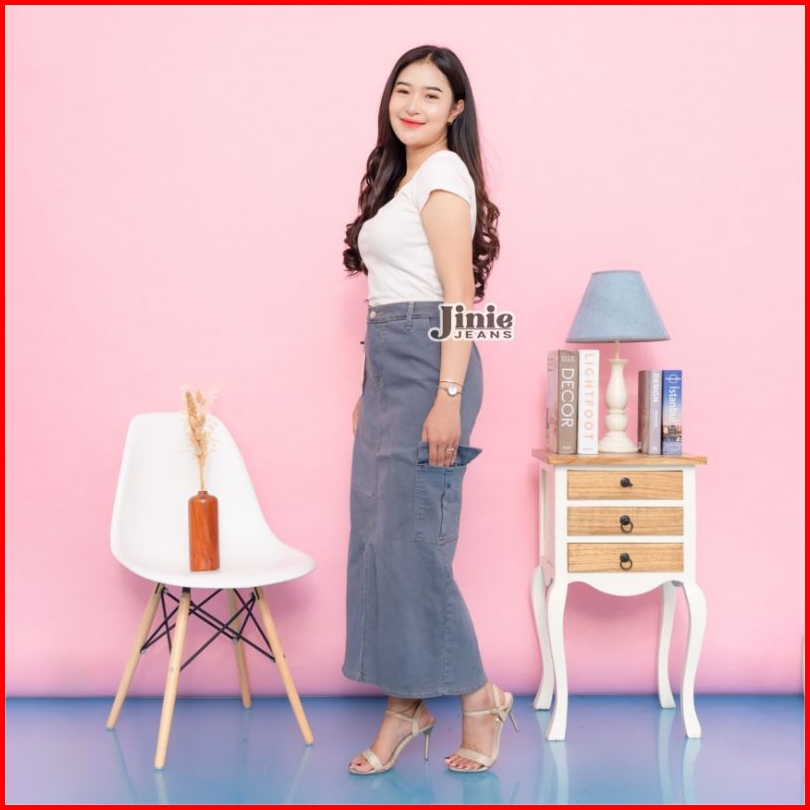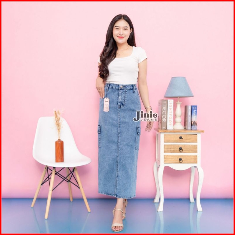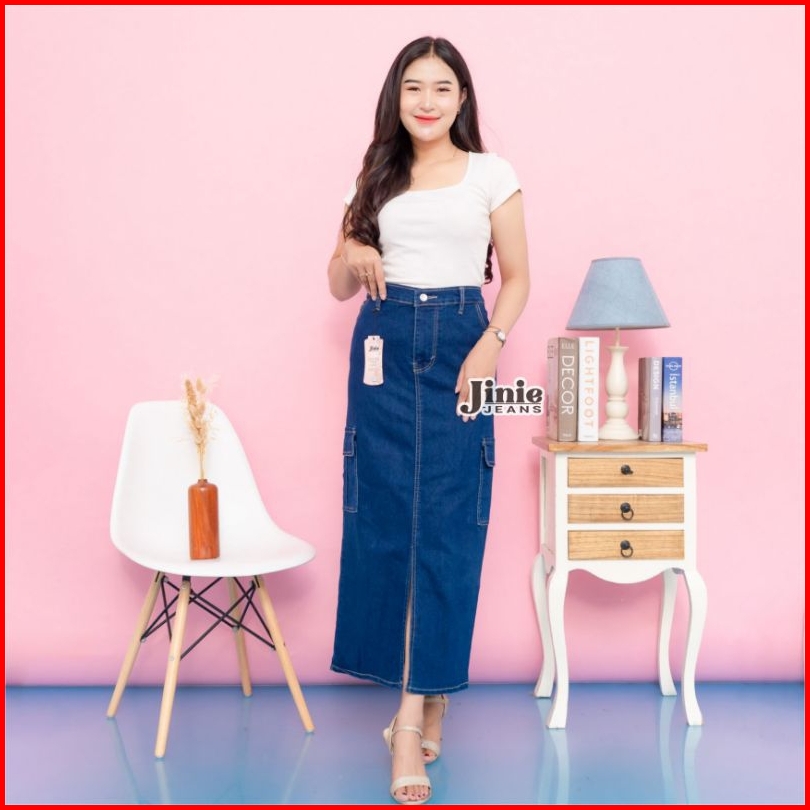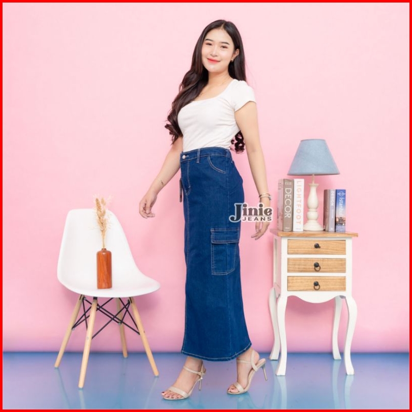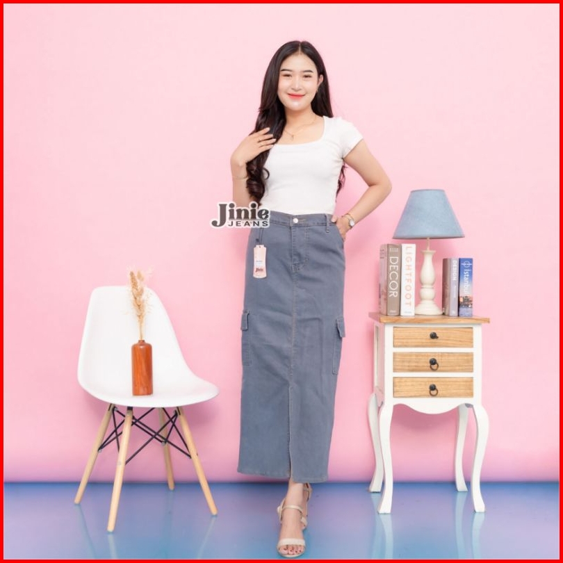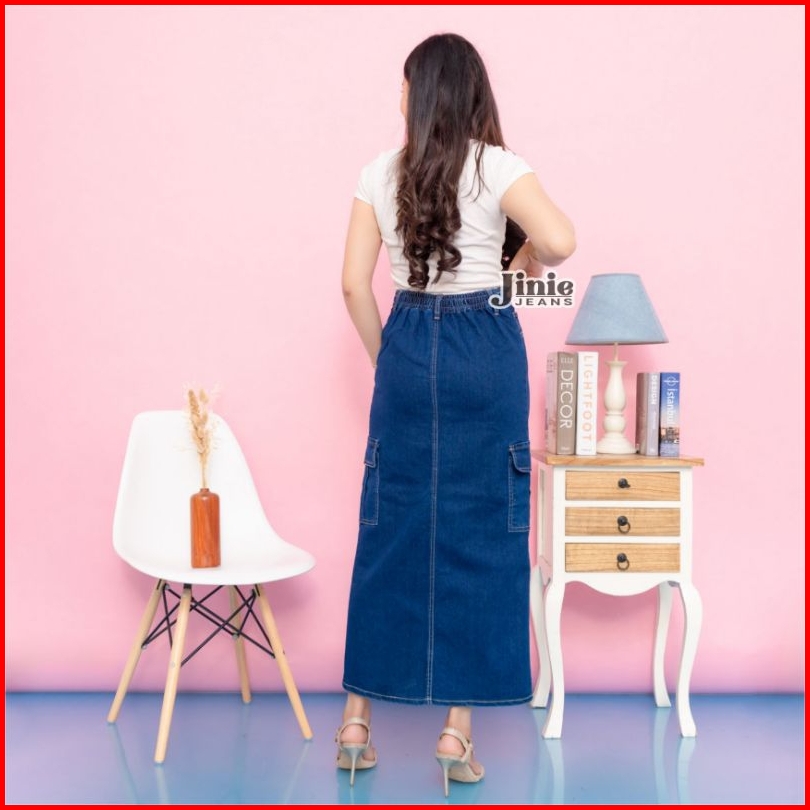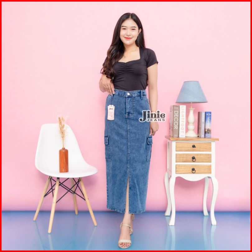 Jiniejeans Rok Jeans Kargo Span Pinggang Karet Bahan Stretch Rok Cargo Wanita Highwaist Belah Depan