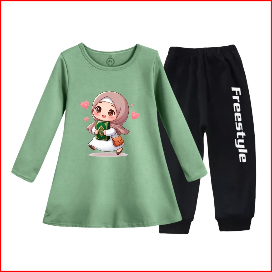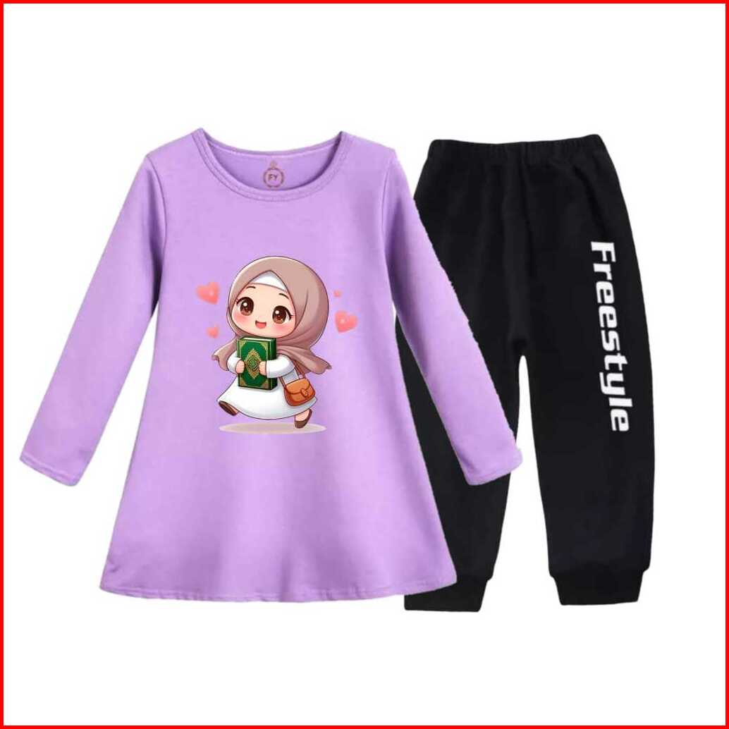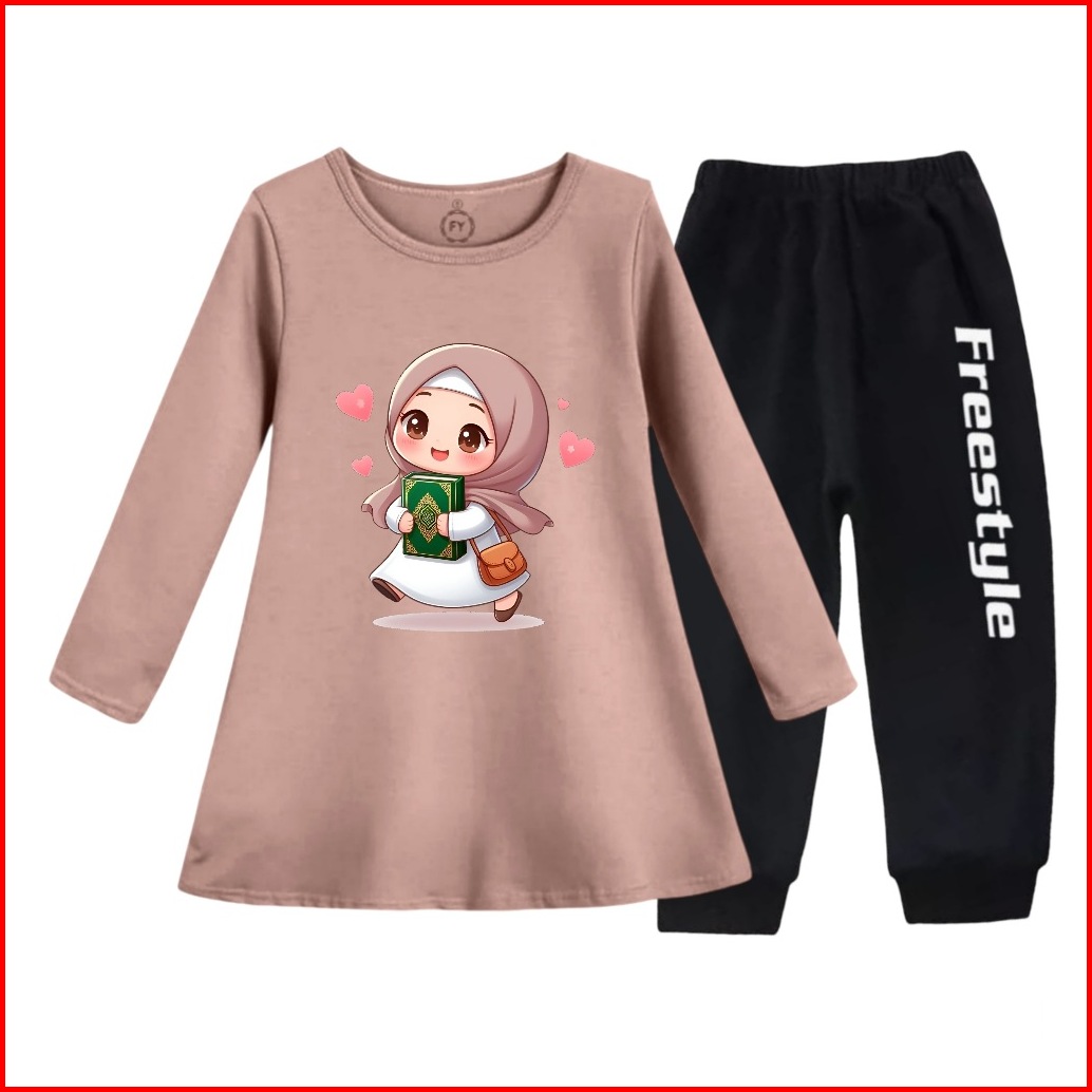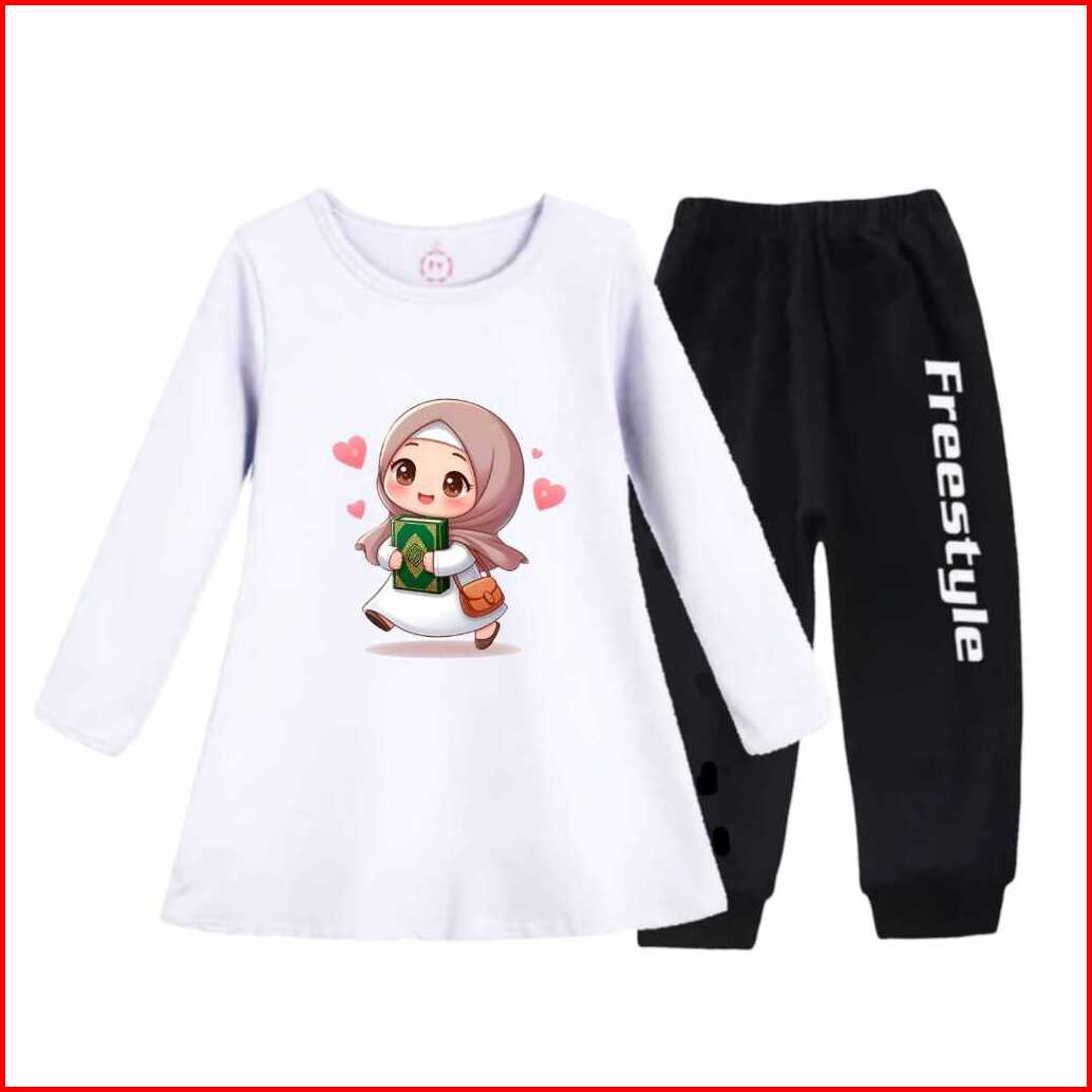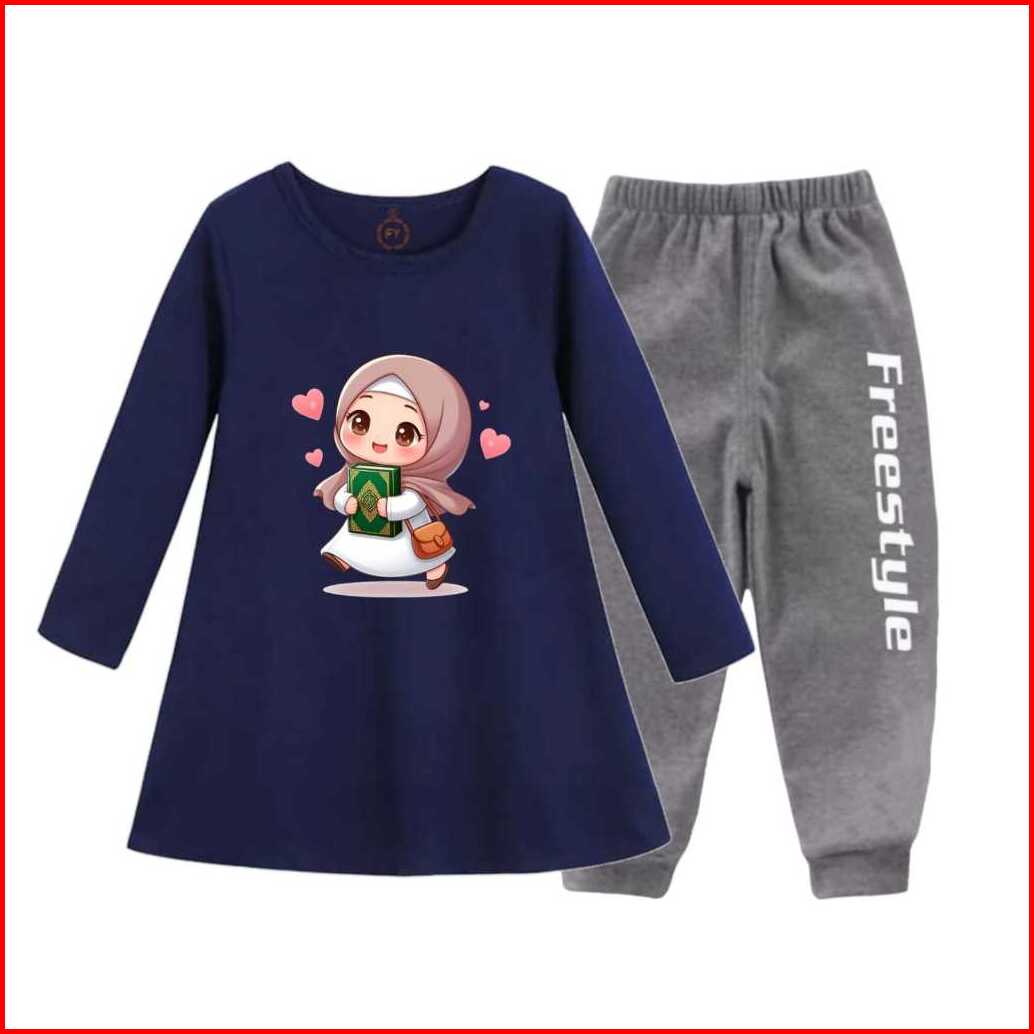 Set Tunik Muslim Anak Perempuan Setelan Dress Anak Cewek Gambar Buku Alquran