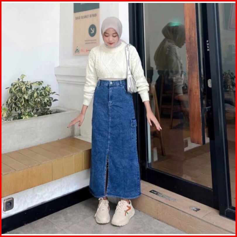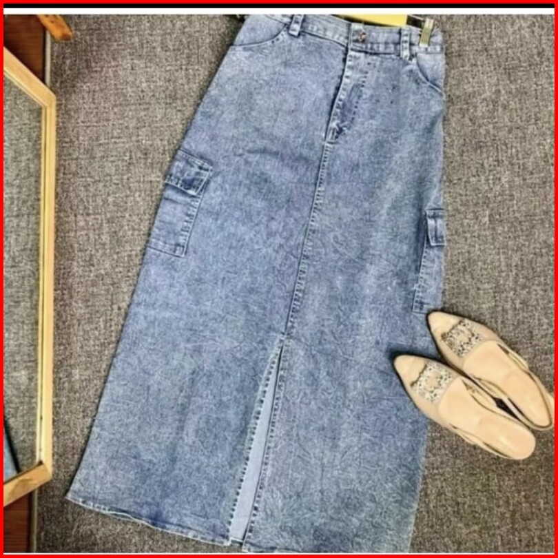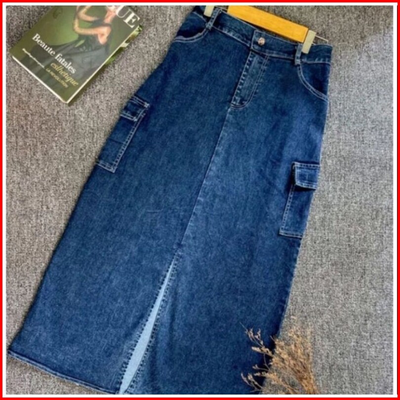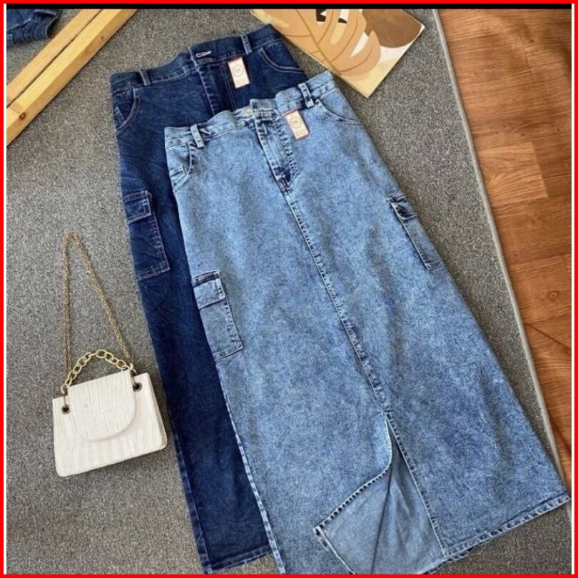 Rok Jeans Cargo Wanita Skirt Panjang Denim Belah Depan