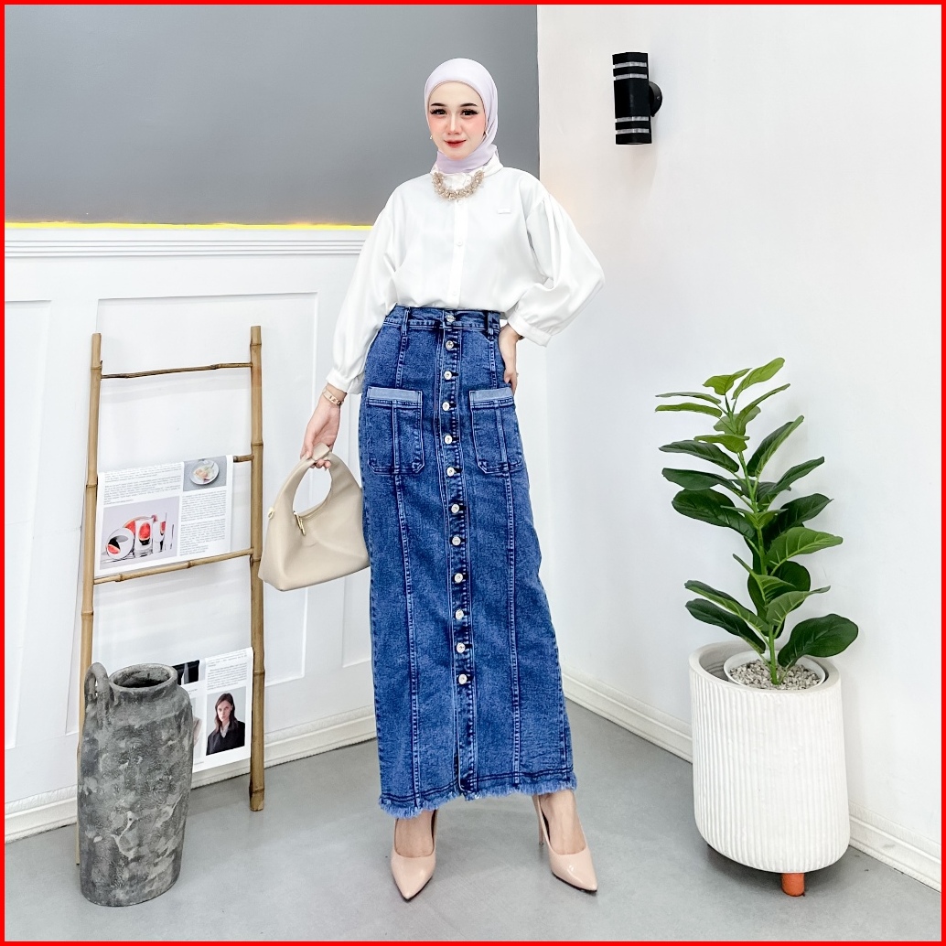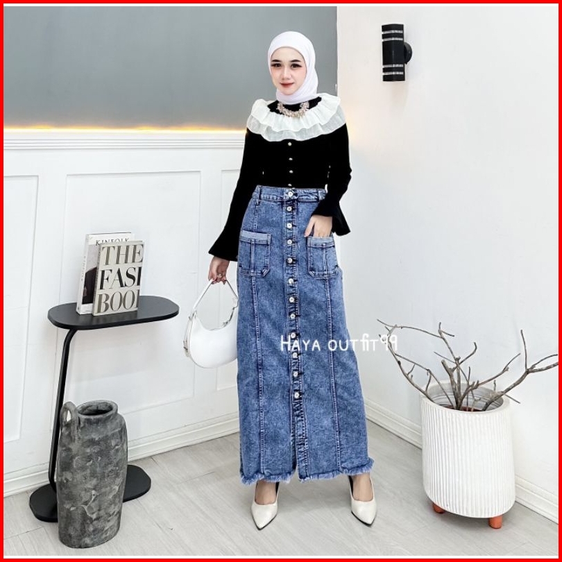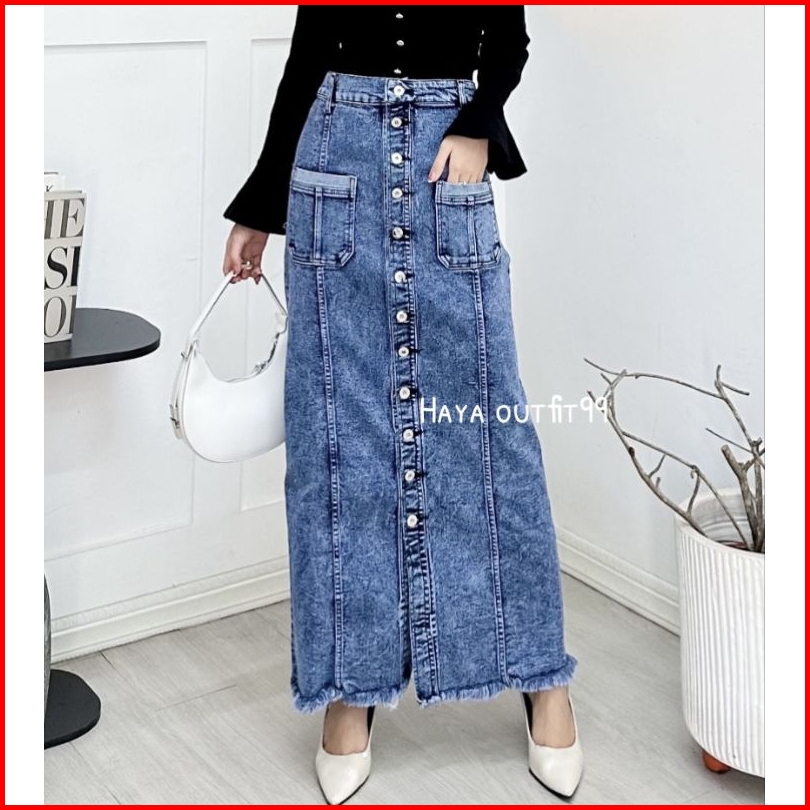 Rok Jeans Tebal Stretch Premium Jeans Kancing Aktif Rawis Bawah