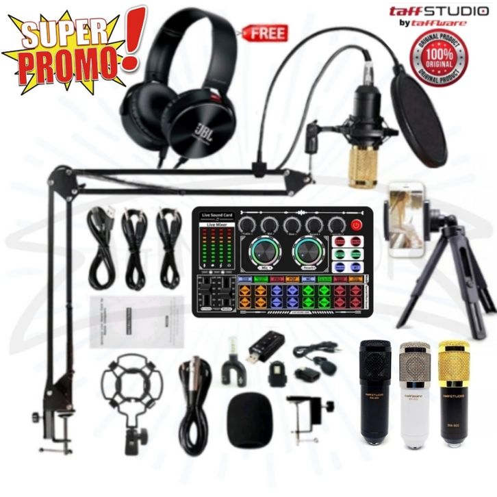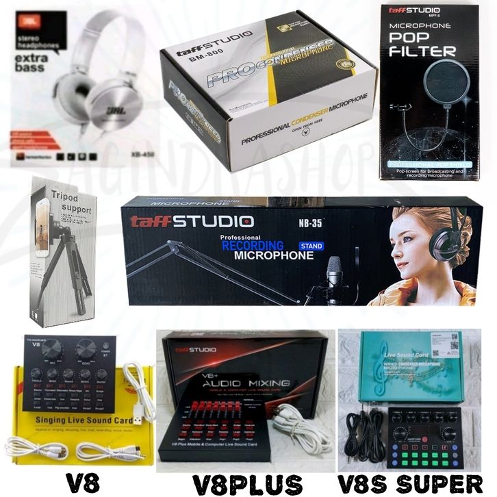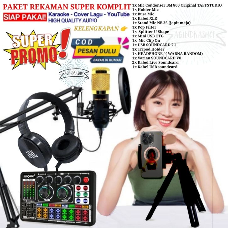 Paket Super Komplit Mic Condenser BM800 + Stand + PopFilter + SoundcardV8 + Headphone + Tripod