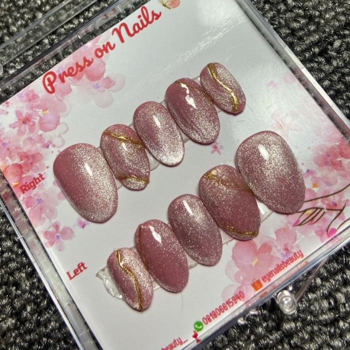 PRESS ON NAILS PINK CAT EYE DENGAN TAMBAHAN CHROME - XS, OVAL