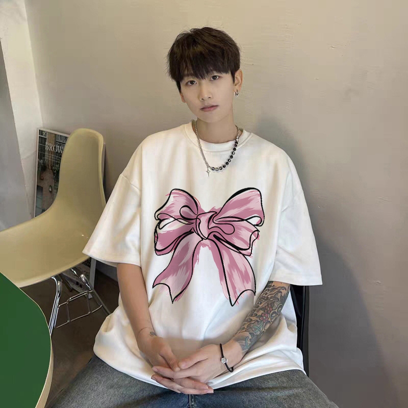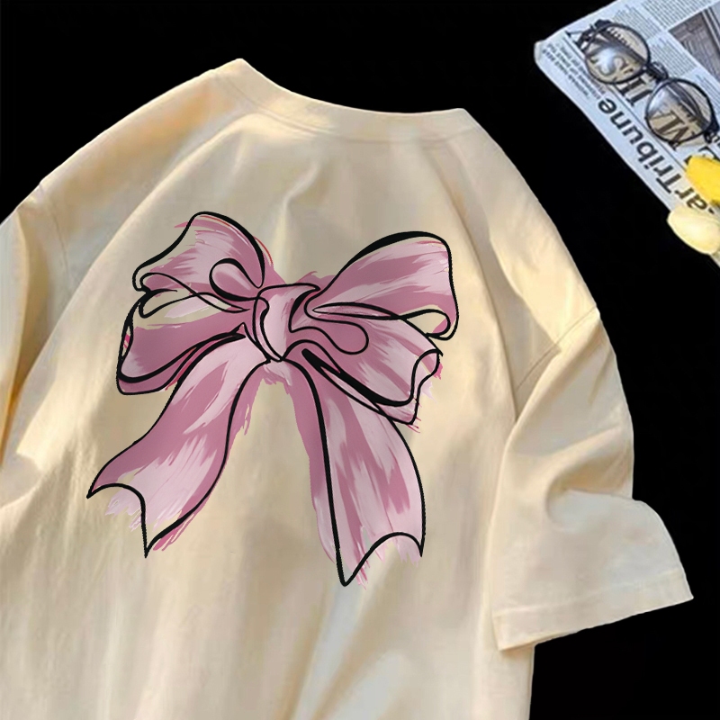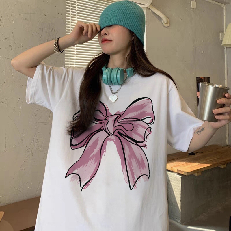 Forteid T-shirt Lengan Pendek Baju Kaos Oversize Wanita Baju kaus wanita korea Baju Atasan Wanita Terbaru cetakan busur merah muda Cotton Atasan Kaos kaos lucu wanita