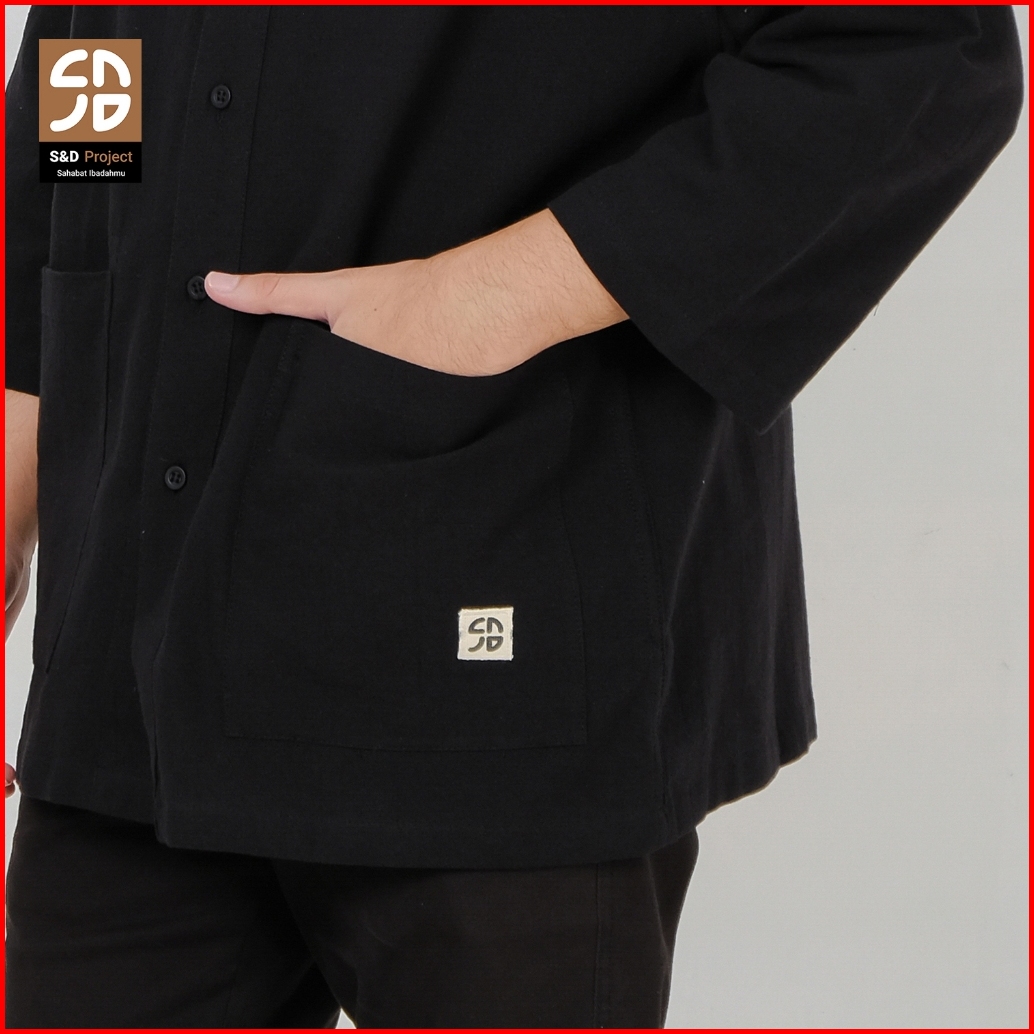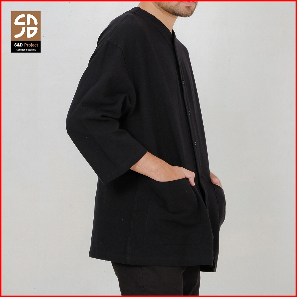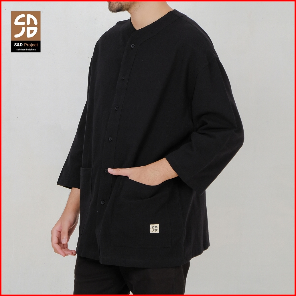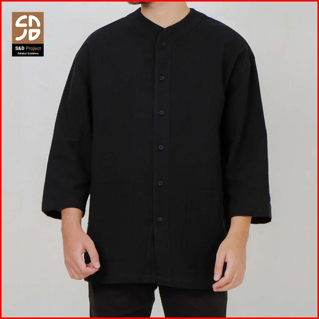 S D Project Baju Koko Rasikh Lengan 7 8 Katun Linen Fumiko Oversize Bersaku Ukuran M L Xl - Hitam