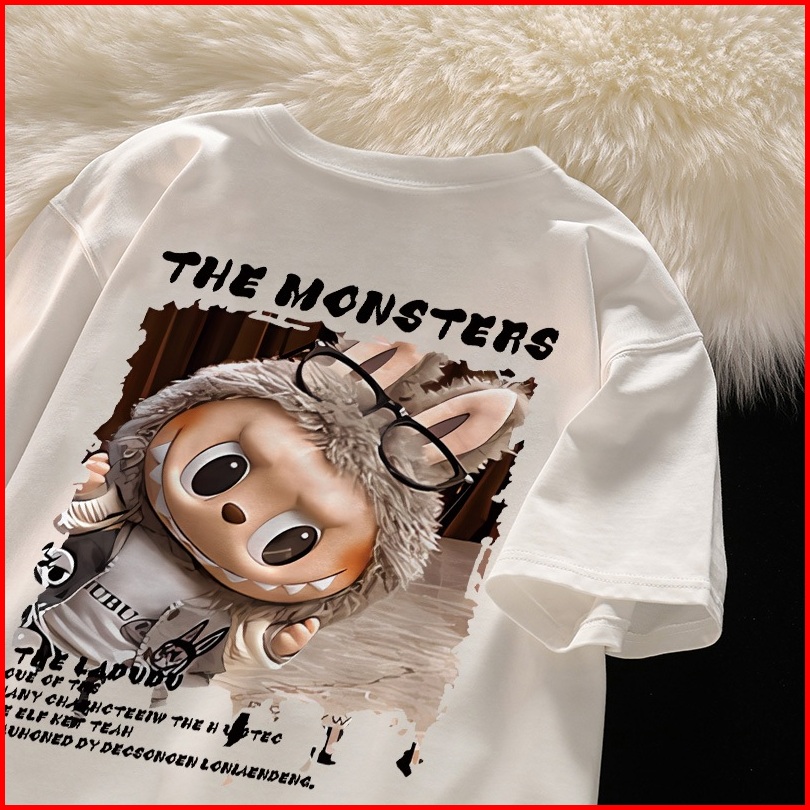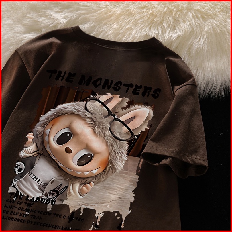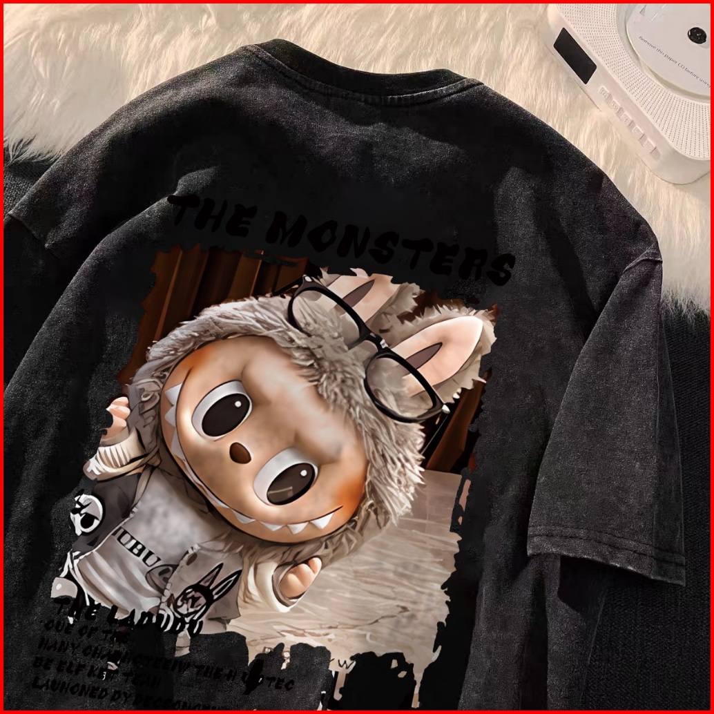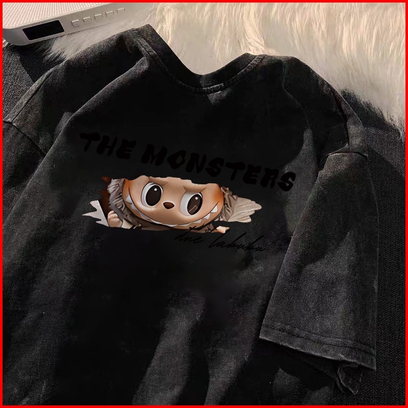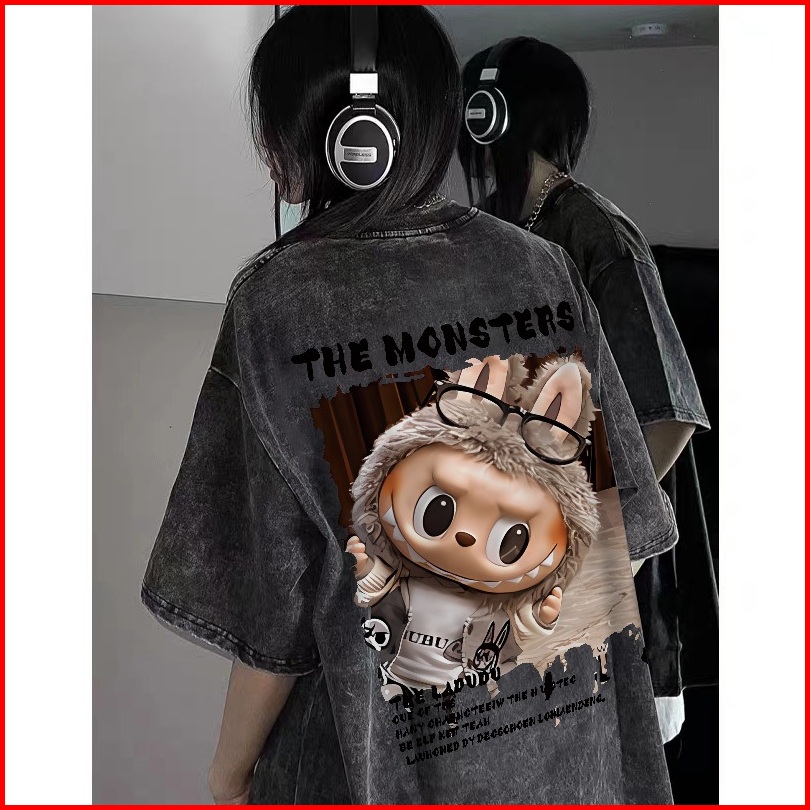 Po Floret Washed Kaos Oversize Cartoon Furry Labubu Katun Murni Retro Style Baju Atasan Wanita Terbaru