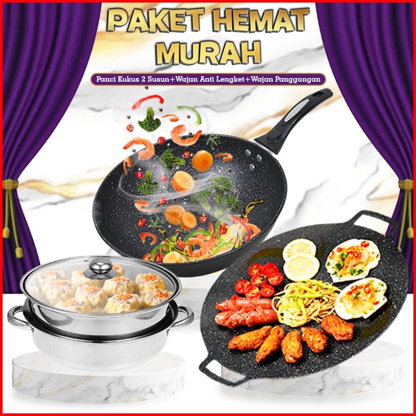 Ss Paket Hemat Murah Wajan Hitam Tebal Diameter 32cm Wajan Panggang 34cm Panci Soup Kukus 2 Susun 28cm