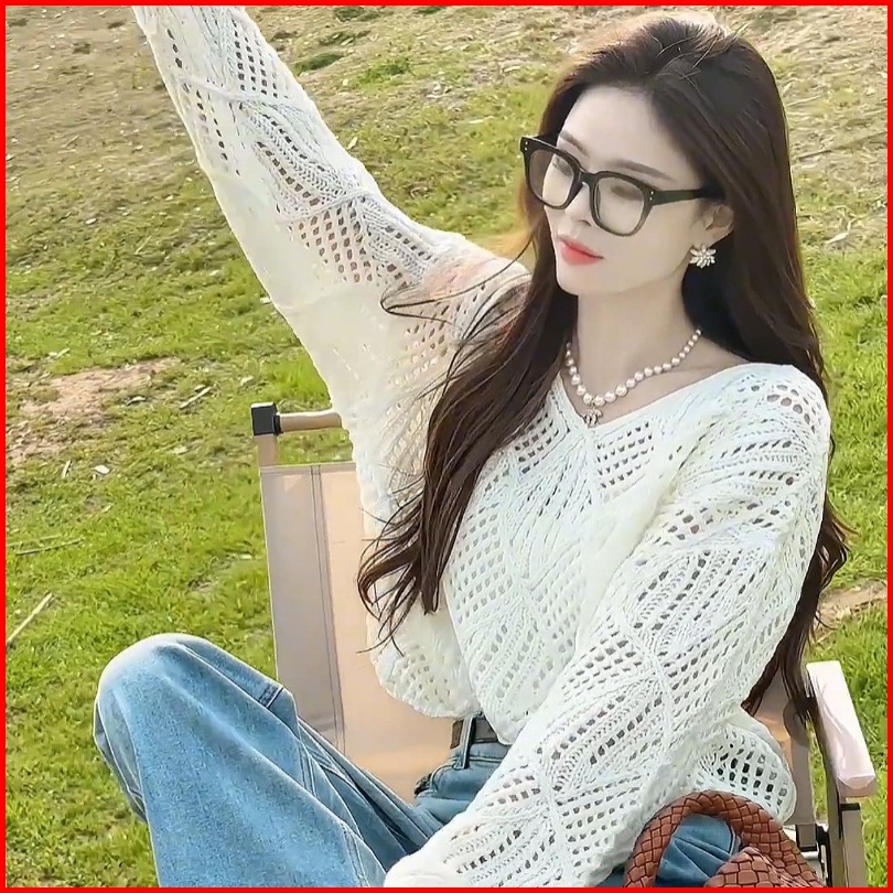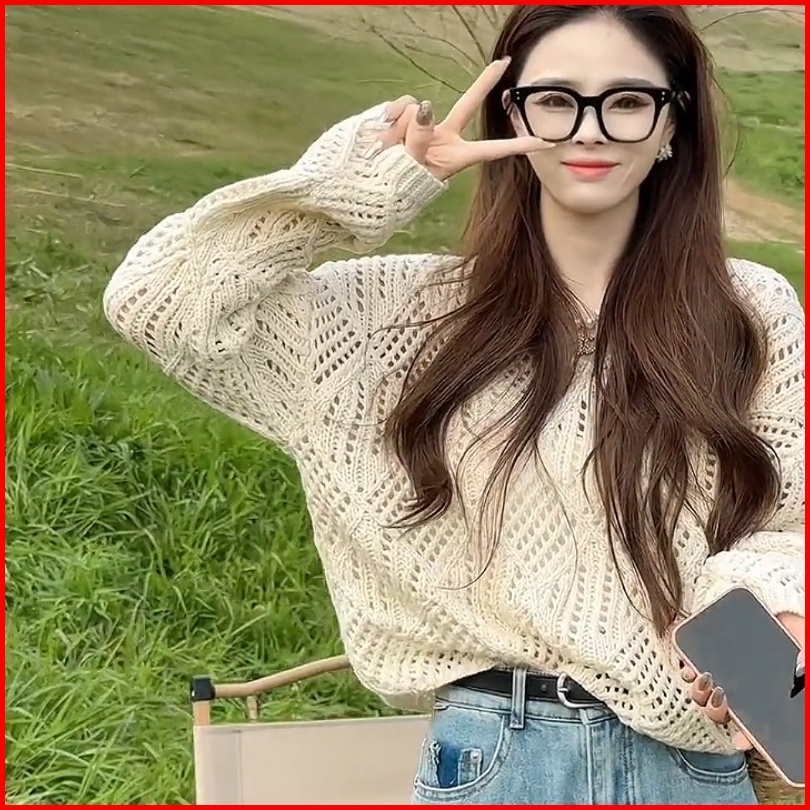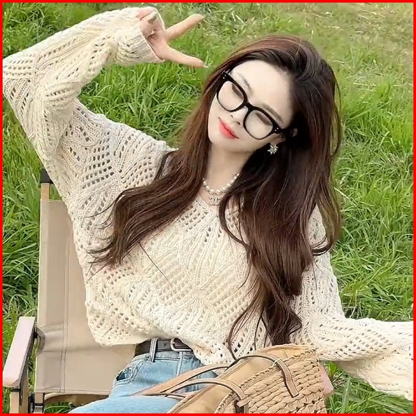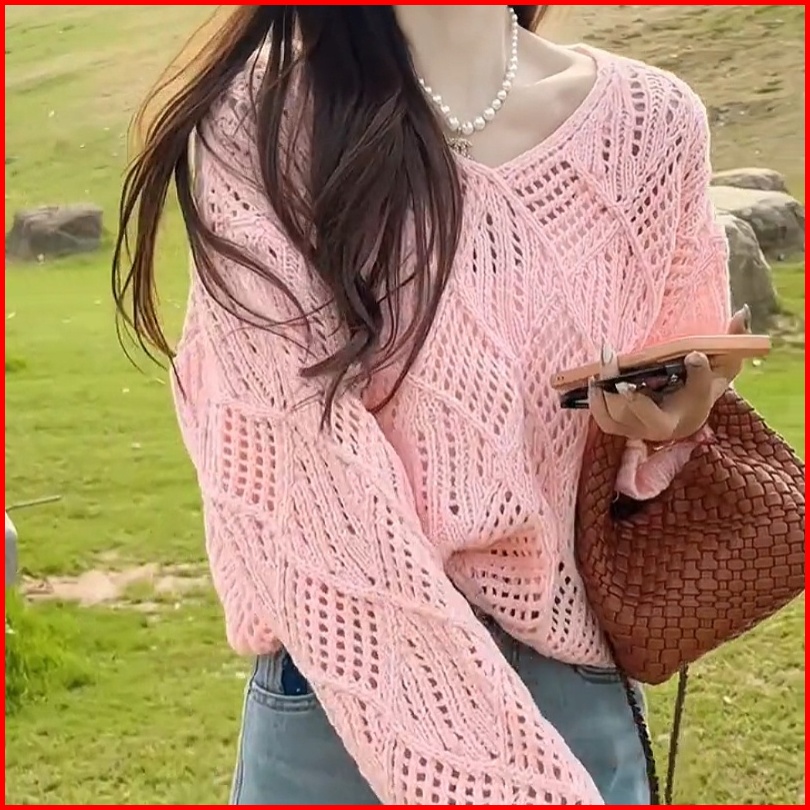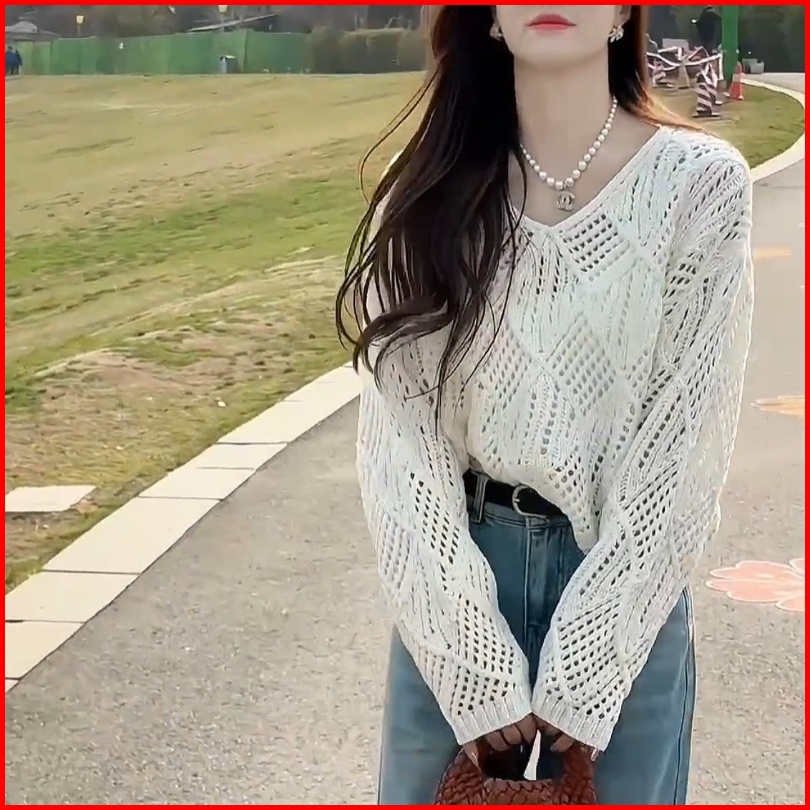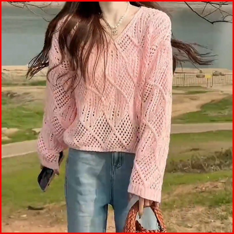 Yuruma Desain Korea Sense V -neck Jacket Cutout Sweater Lengan Panjang Longgar Top