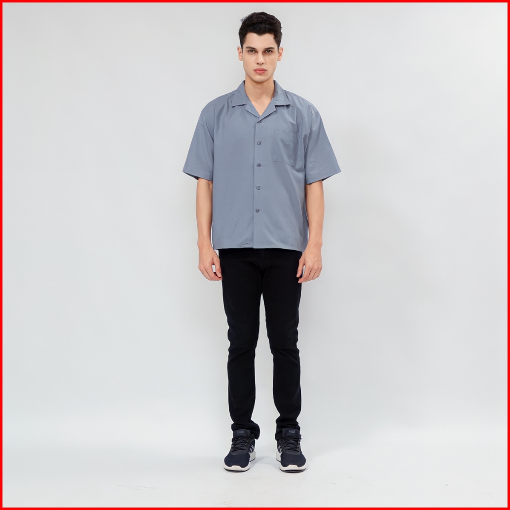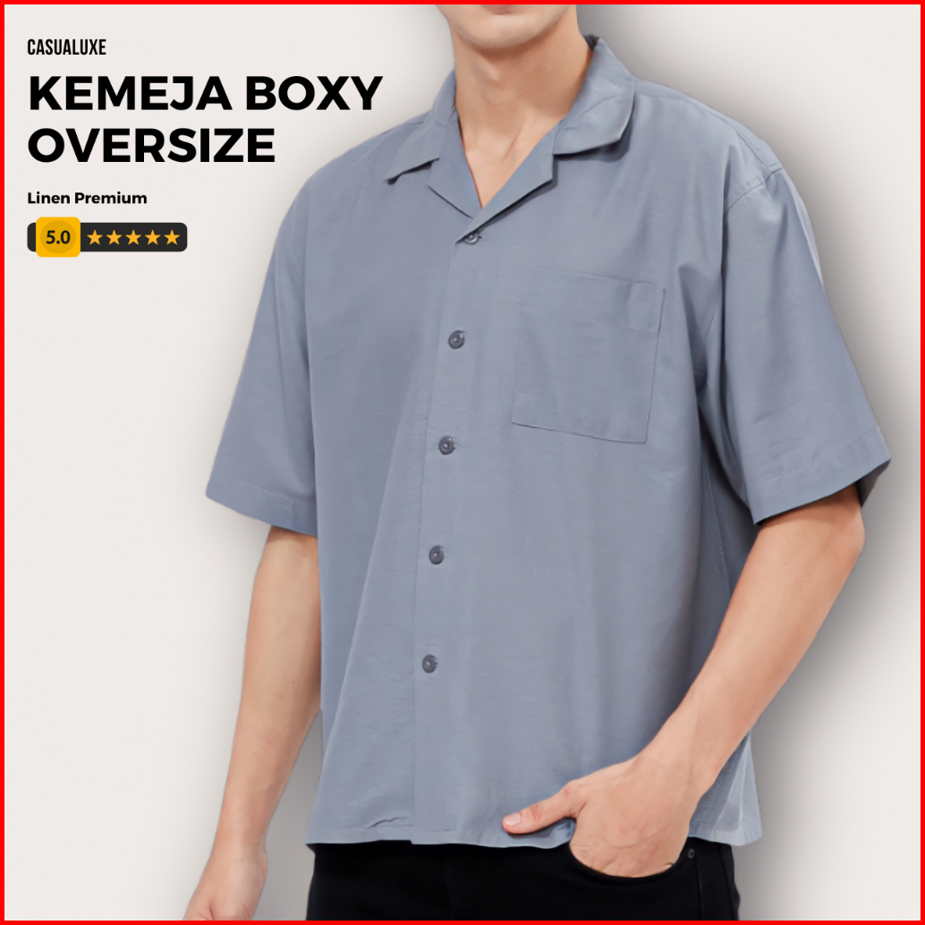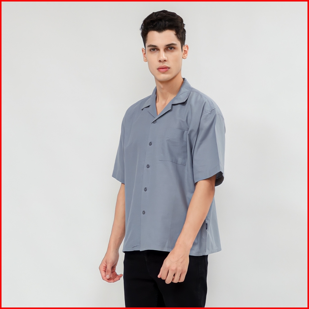 Casualuxe Cuban Bowling Boxy Oversized Linen Shirt Kemeja Polos Kerah Terbuka Lengan Pendek Abu Muda