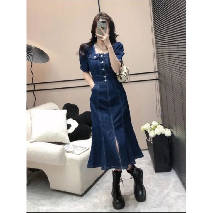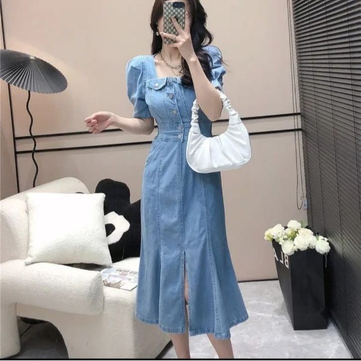 Dress Jeans Wanita Lengan Pendek + Belakang Karet
