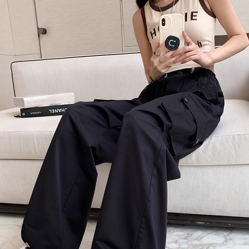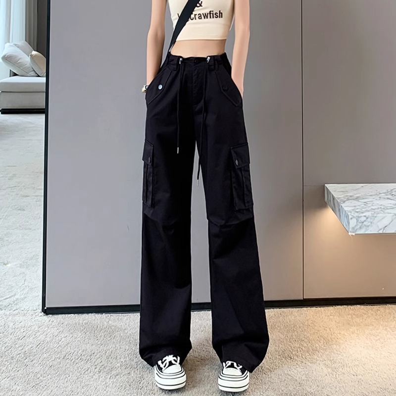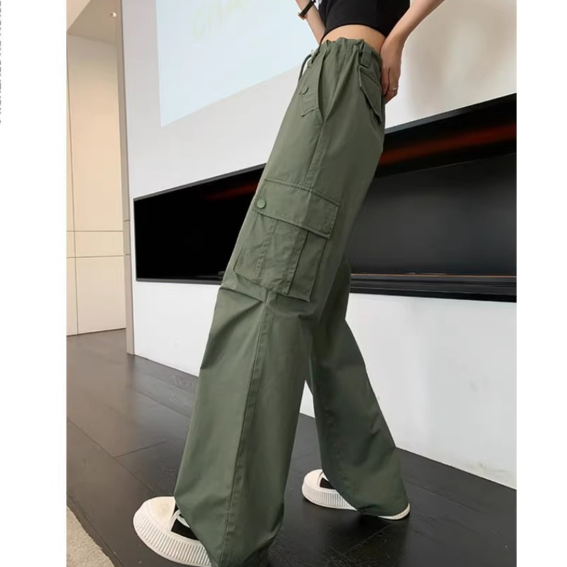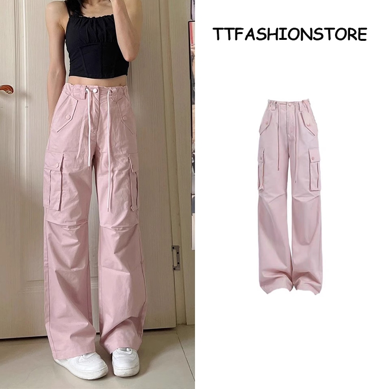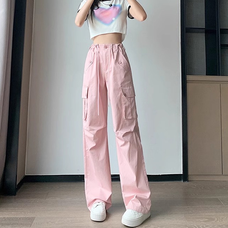 ❤️Celana cargo Lurus Pinggang Tinggi Gaya Korea Kulot Serut Pink Kasual Wanita