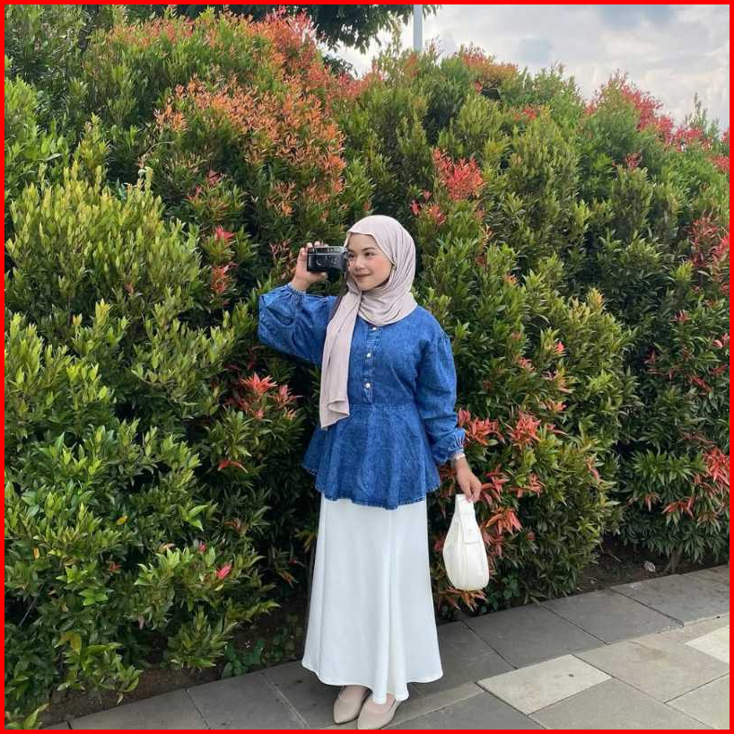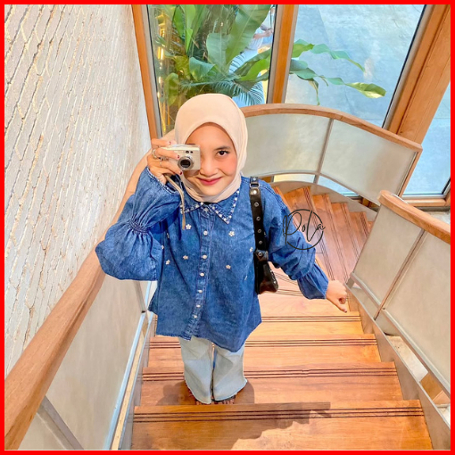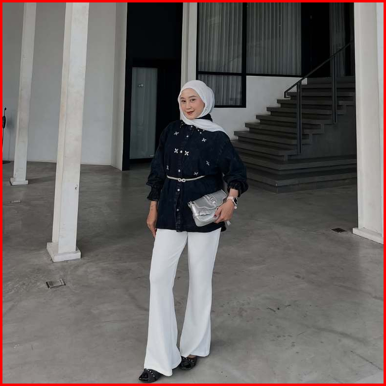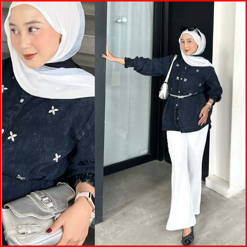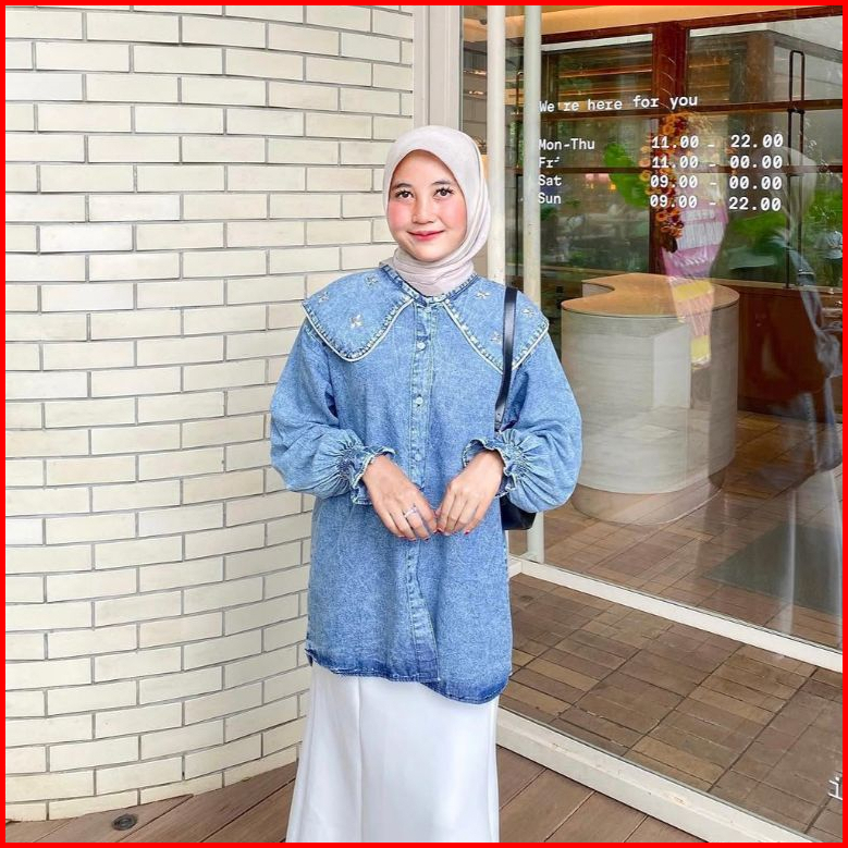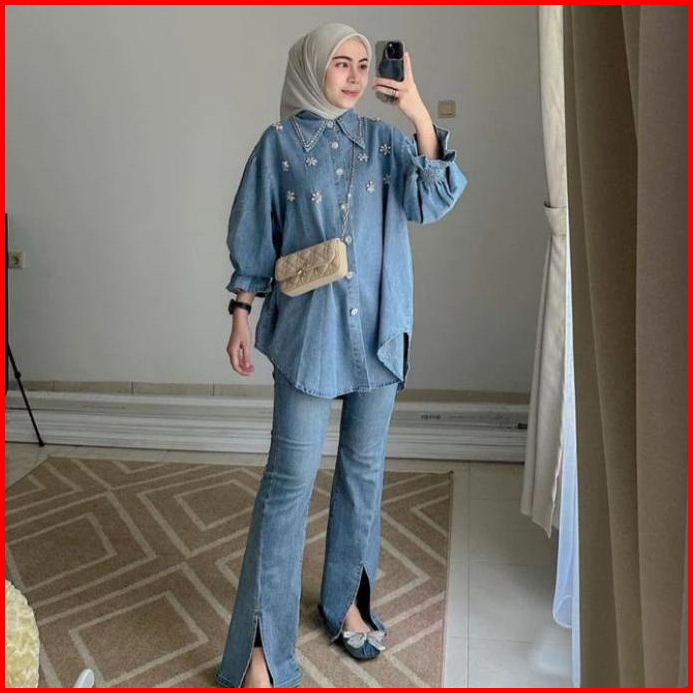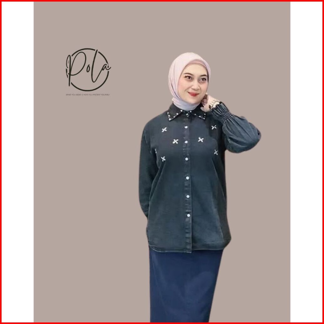 Pola Wear Twyla Kemeja Jeans Wanita Payet Atasan Oversize Denim Lengan Karet