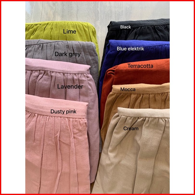 Black, Broken White, Blue Elektric, Terracotta, Dark grey, Mocca, Lavender, Beige, Cream, Cinnamon, Olive, Army, Clover, Lime, Plum, Peach, Mint, Denim blue, Ochre, Matcha, Baby blue, Melon green, Navy, Green bottle, Dusty pink, Dark choco, Ovomaltine