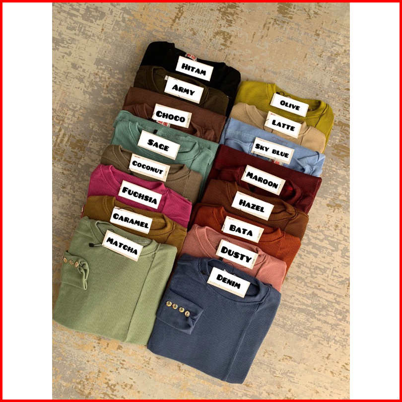 HITAM, ARMY, CHOCO, SAGE, COCONUT, OLIVE, SKY BLUE, MAROON, BATA, DUSTY, DENIM, BOTTLE, NAVY, Frapucino, Lavender, Charcoal gray, Soft denim, Magenta, Taro, Mustard, Putih bw, Latte, Dark choco, Mocca, Misty gray, Light misty, Gray, Coksu, Putih bersih, Dark lilac, Mint, Coklat coffe, Brunette, Beige, Hazelnut, Pink soft, Pink dusty, Fuchsia