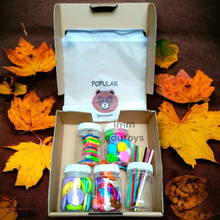 5 in 1 Mainan Montessori Busy Jar Fine Motoric Play Mainan Sensory Mainan Edukasi Anak Pompom Push Stick Taggie Jar Boto