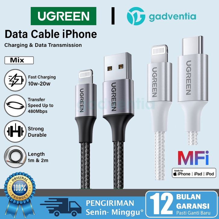 UGREEN Kabel Charger Data iPhone 6 7 8 X XR XS 11 12 13 14 Series iPad MFi USB To Lightning Dan Type C To Ligntning
