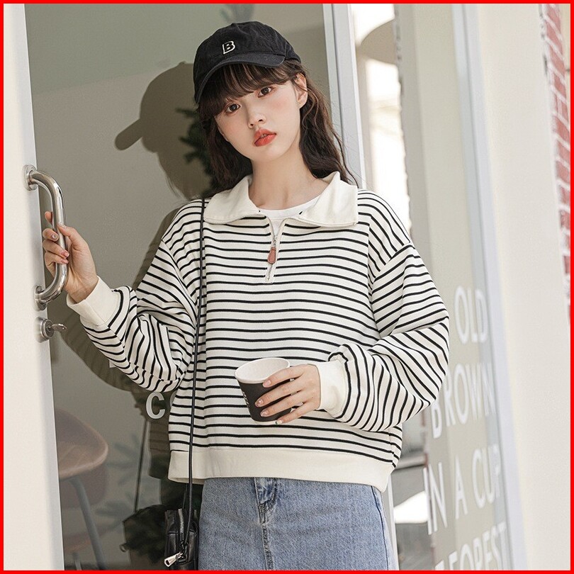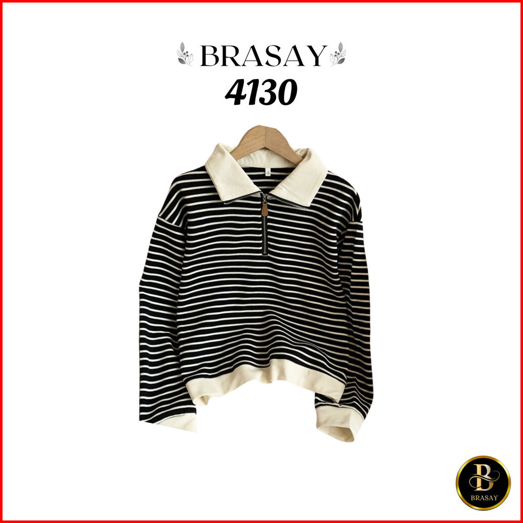 Brasay Knitwear Kaos Sweater Kerah Wanita Lengan Panjang Zip Rajut Sreetwear Garis Sweater Wanita Premium 4130