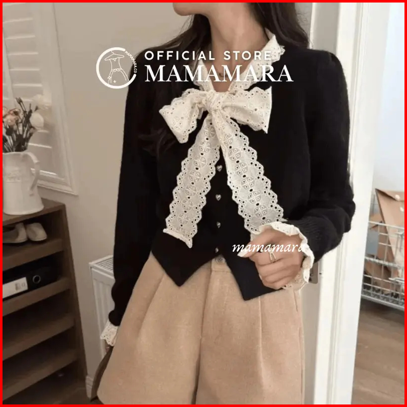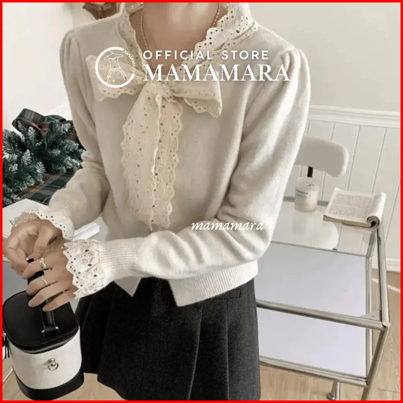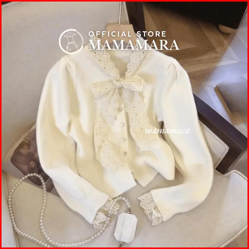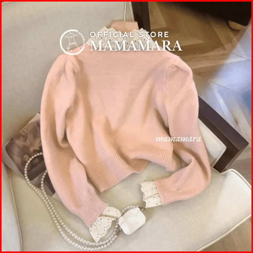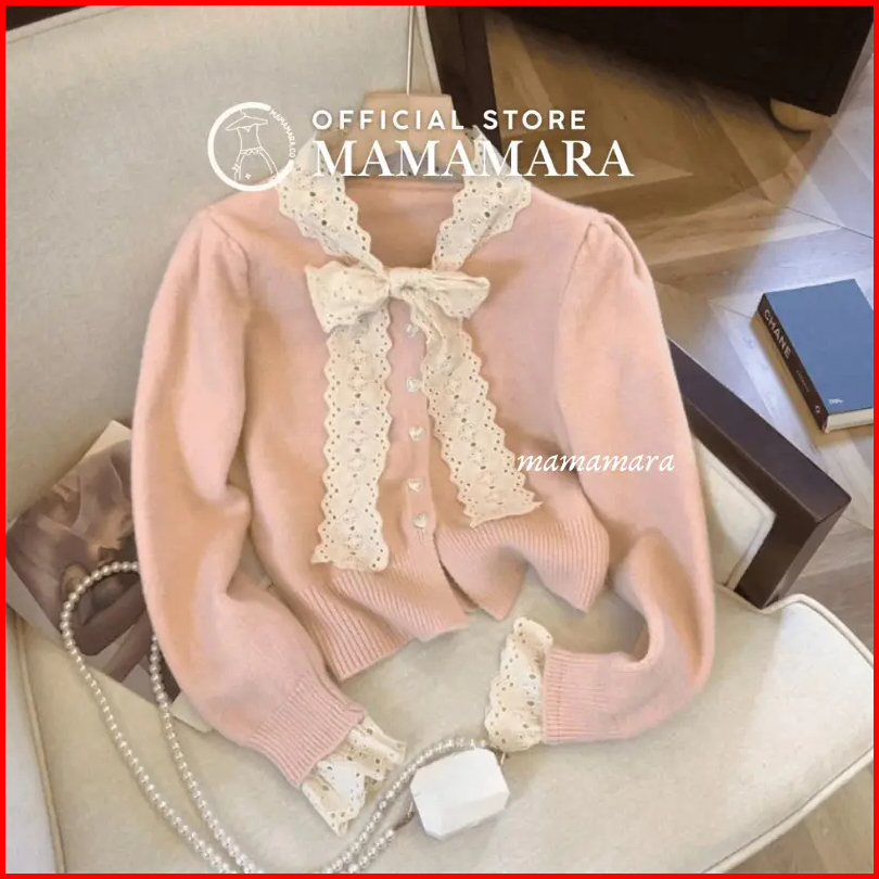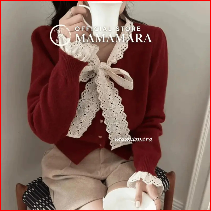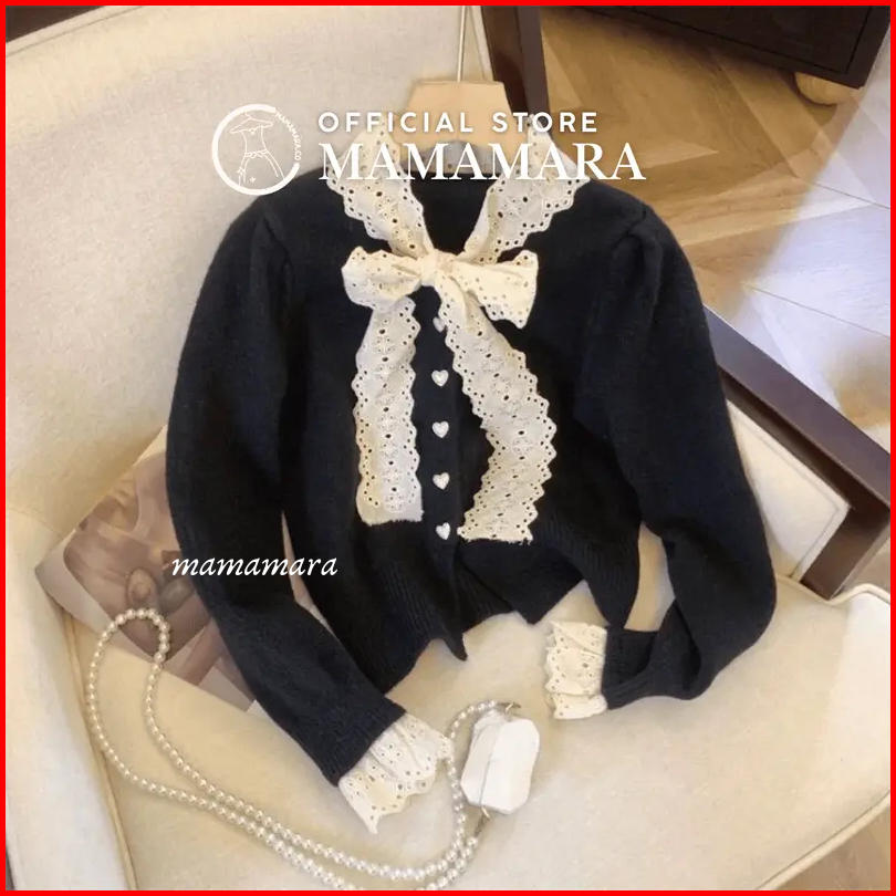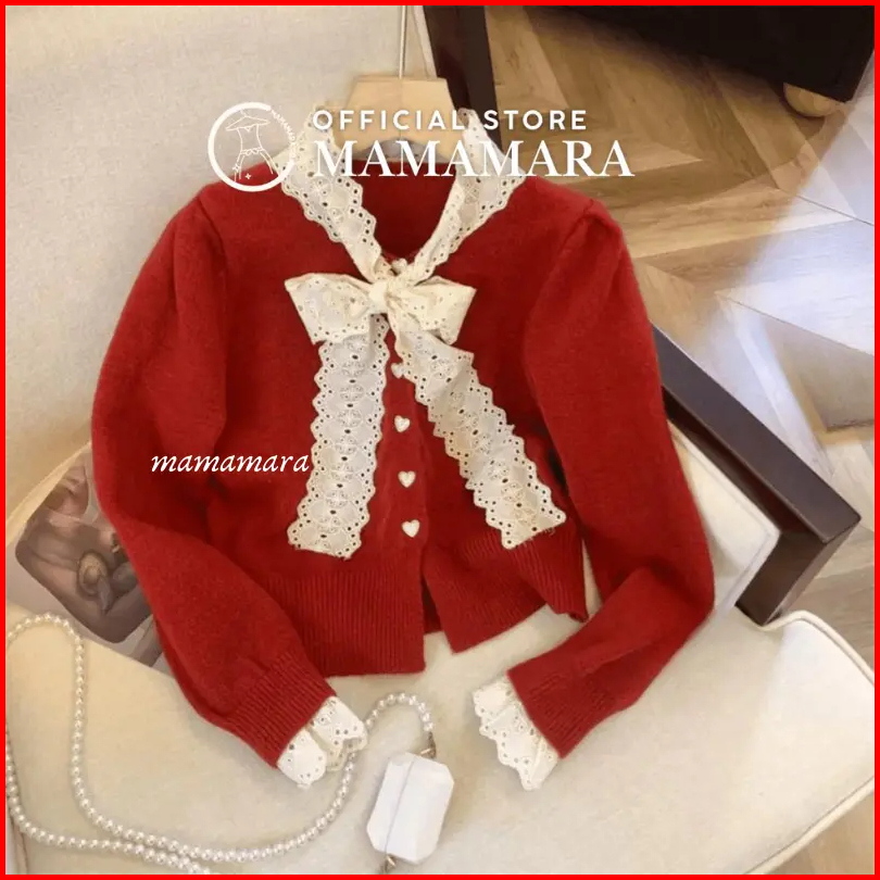 Mamamara - Atasan Rajut Blouse Wanita Knitwear Kancing Love Round Neck Polos Kombinasi Renda