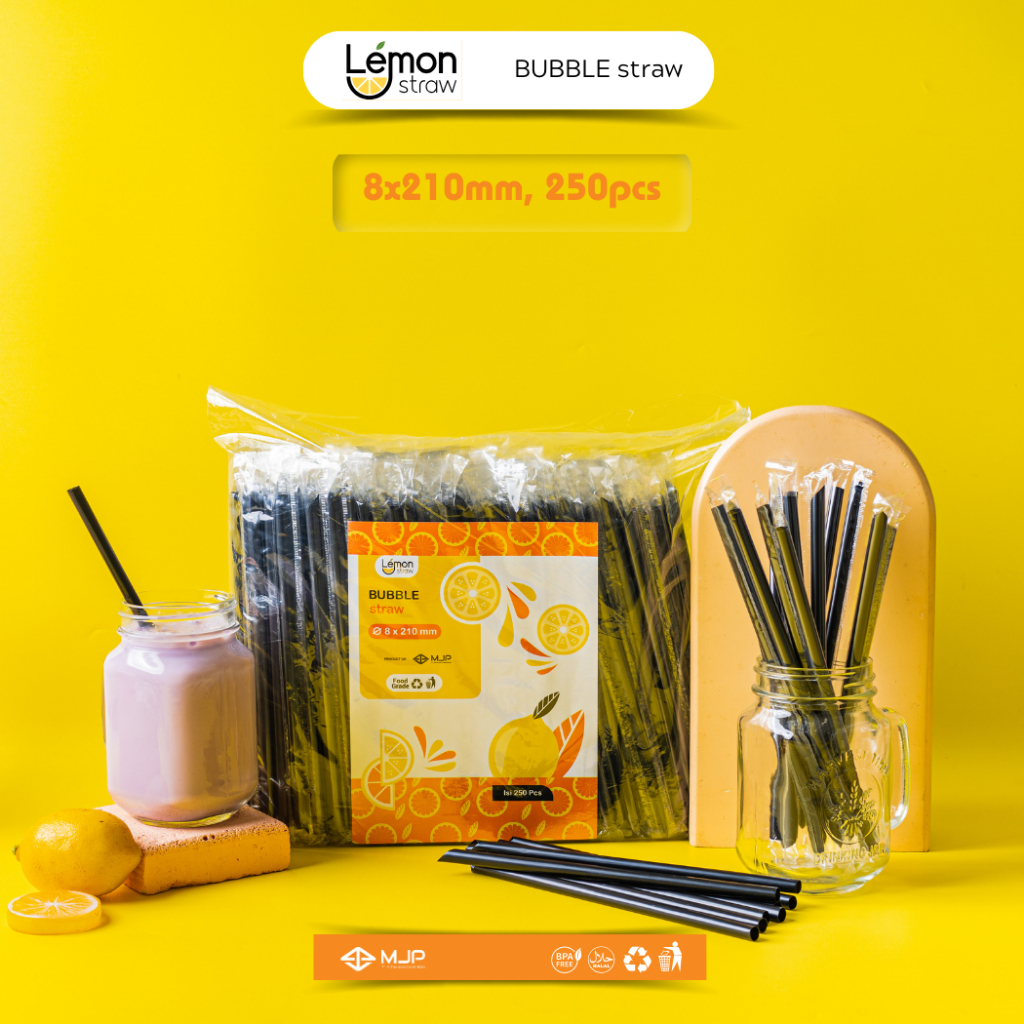 Sedotan Bubble Boba Runcing Steril Hitam Bungkus Plastik, Merk Lemon Straw