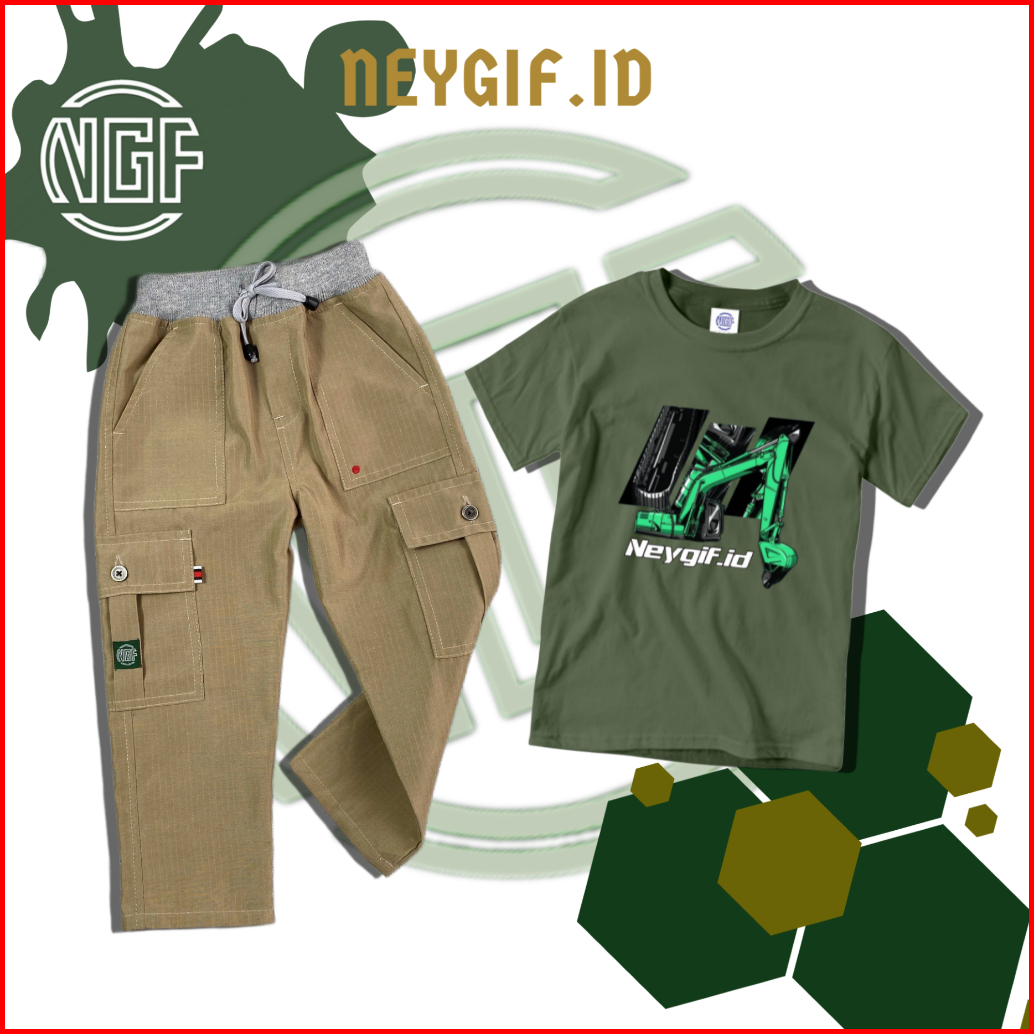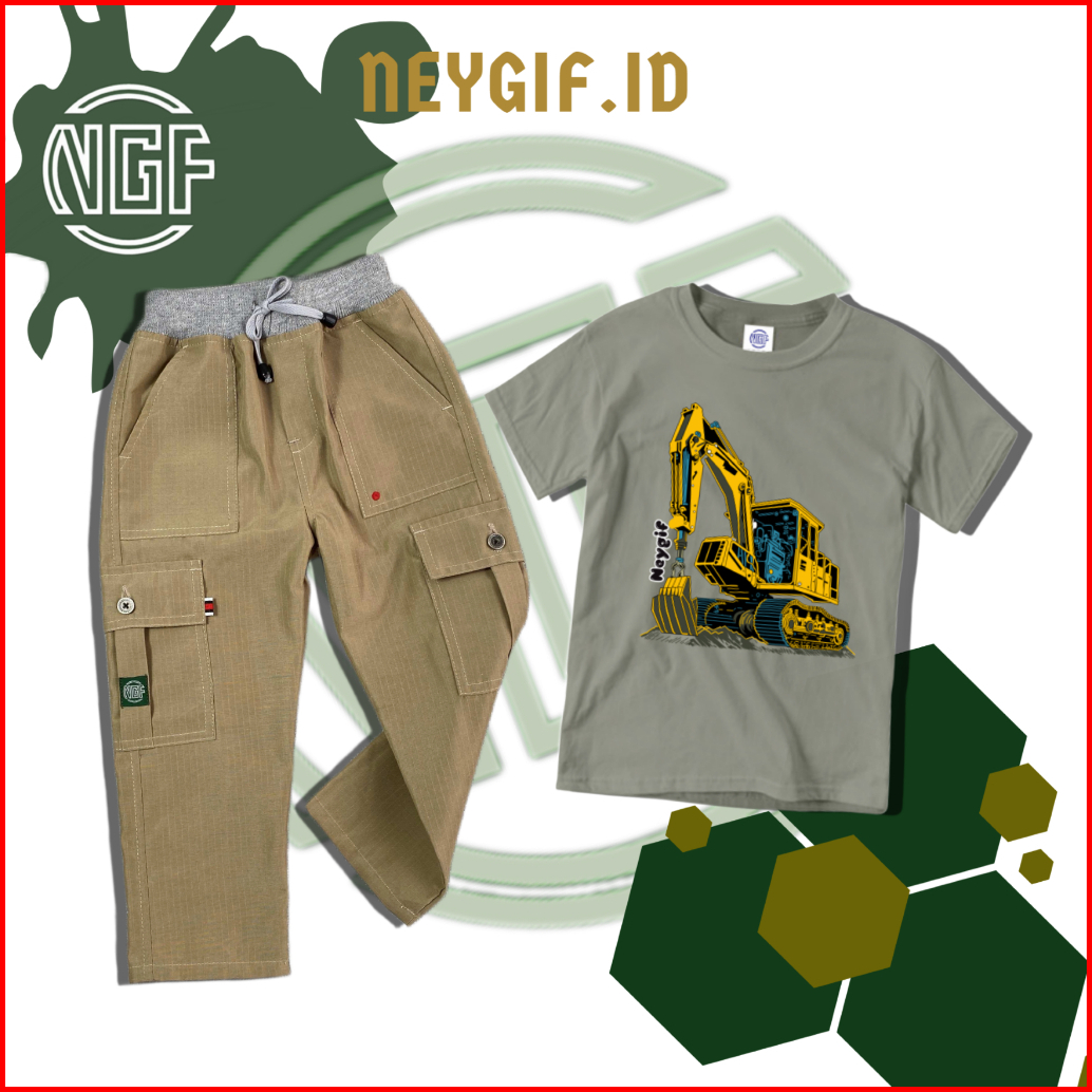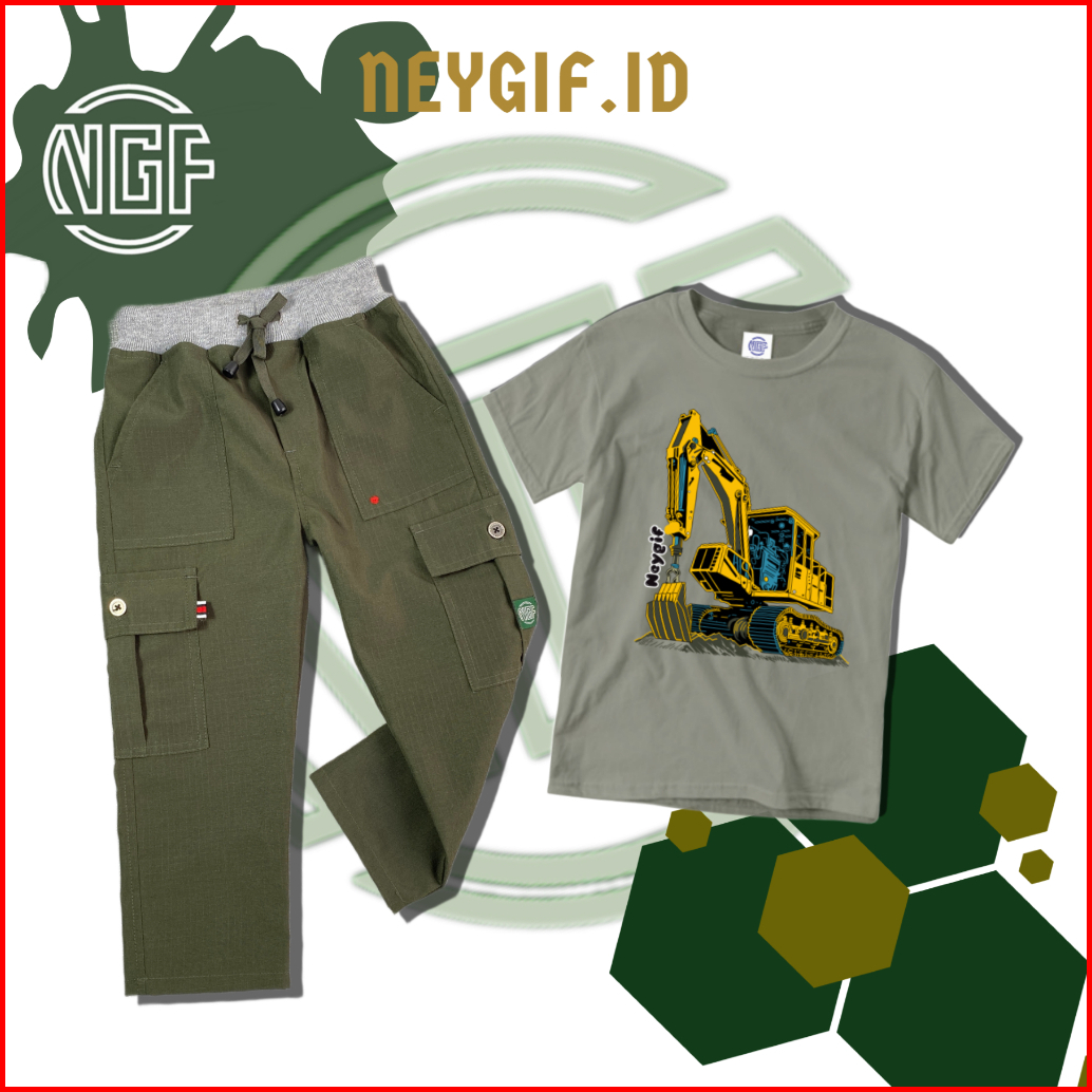 Setelan Anak Oneset Kaos Gambar Excavator Bawahan Celana Cargo Ripstok Panjang Untuk Usia 4-12 Tahun