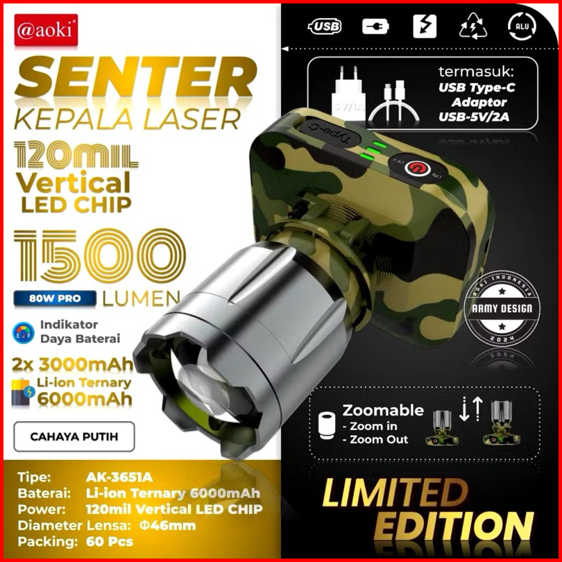 Senter Kepala Cas Aoki 80w 6000mah Led Laser Zoom In Out 3 Mode Super Terang