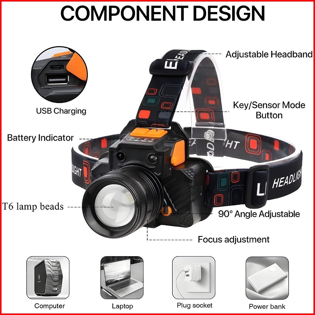 L9 Senter Kepala Led Terbaru Zoom Super Terang Powerbank Tahan Air Sensor Gerak Outdoor