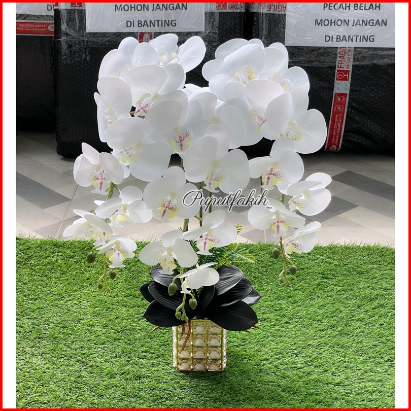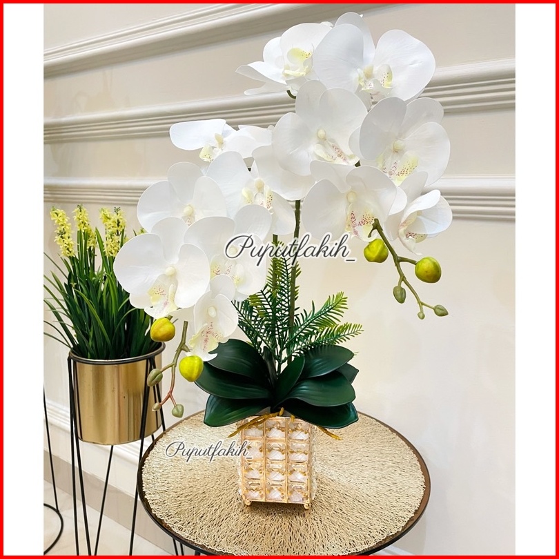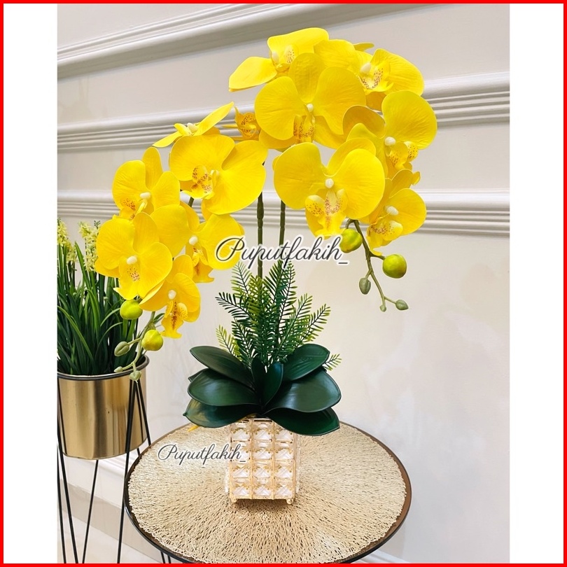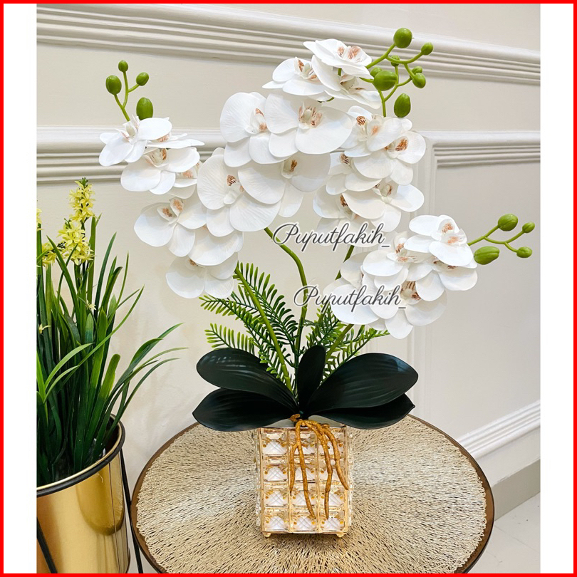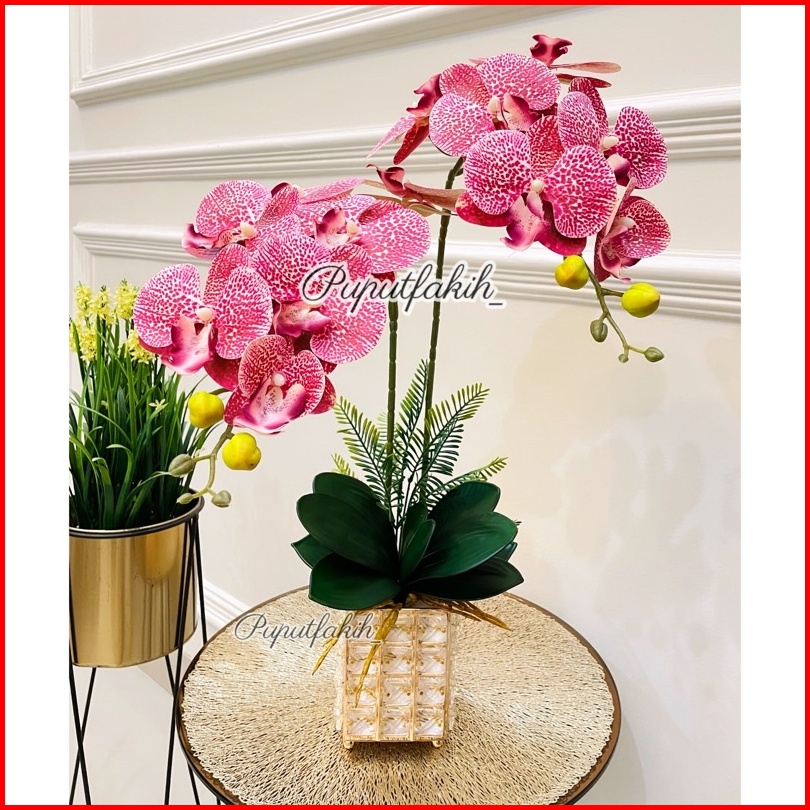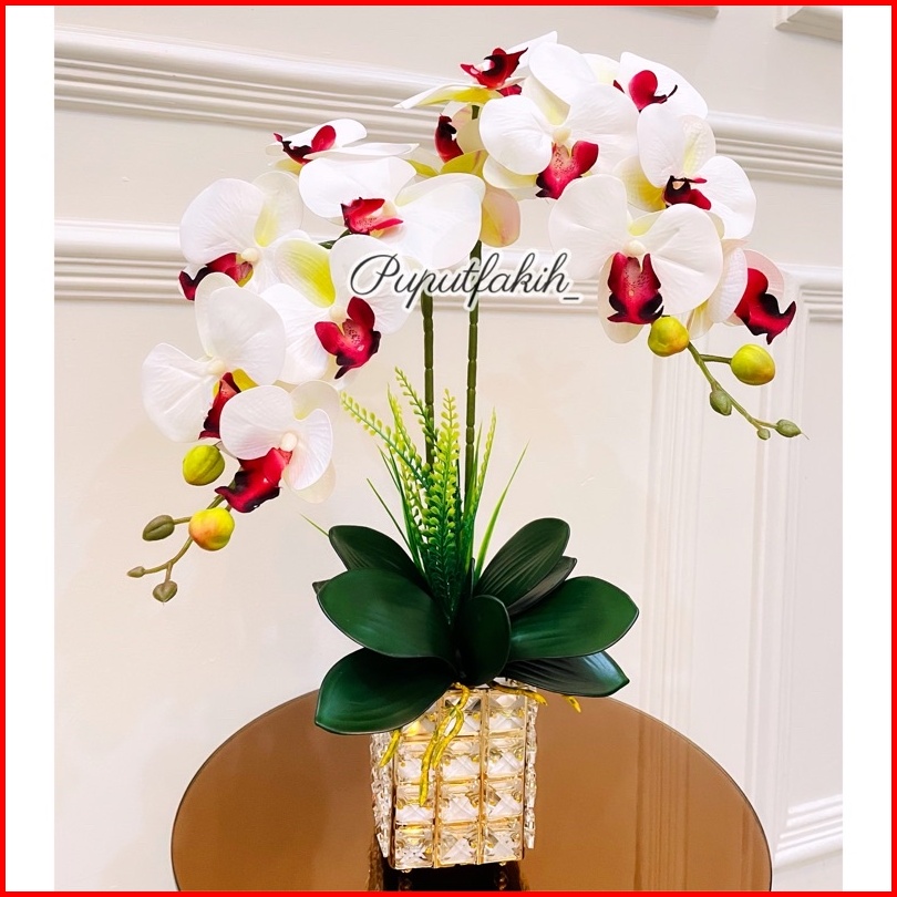 Vas Crystal Dengan Bunga Anggrek Latex 2 Tangkai Daun Rimbun Vasgold Anggrek Sudah Di Rangkai