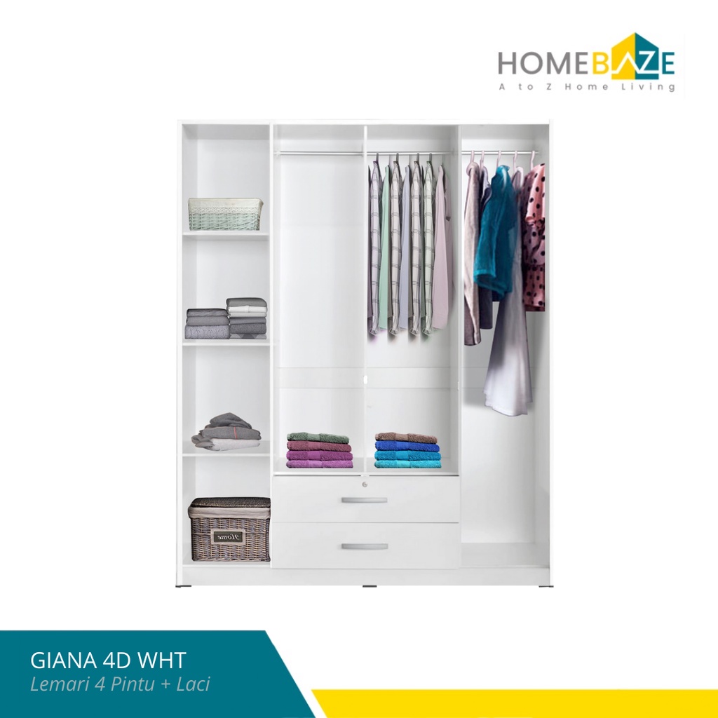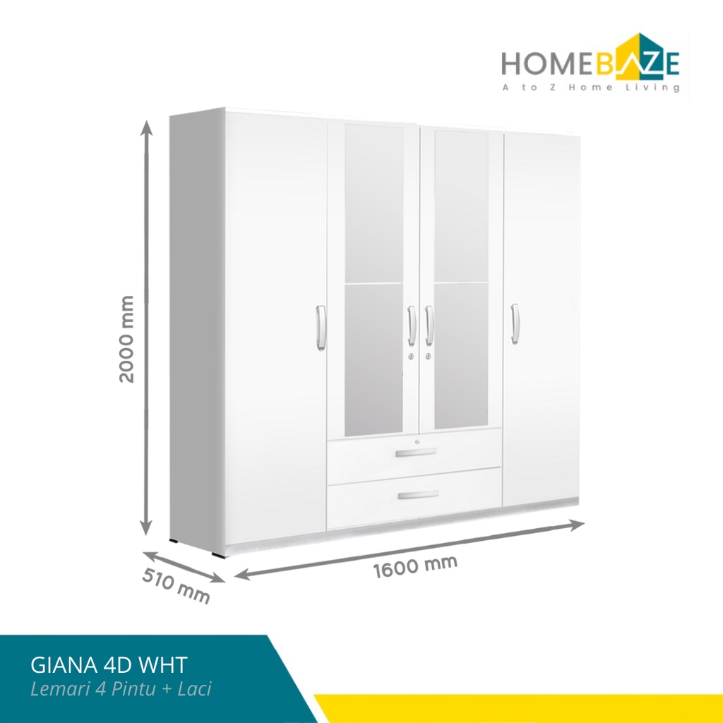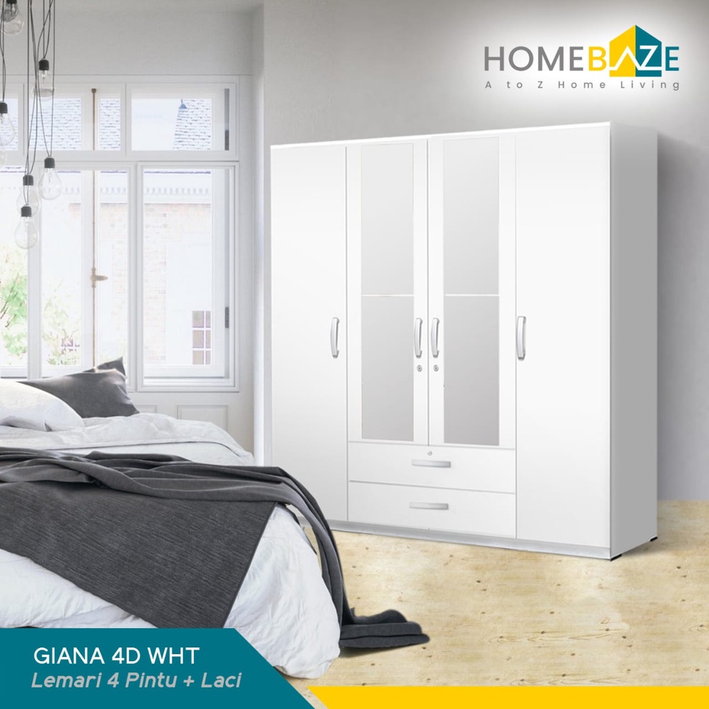 Lemari Pakaian 4 Pintu Kaca Cermin + Laci Putih Minimalis dan Kokoh