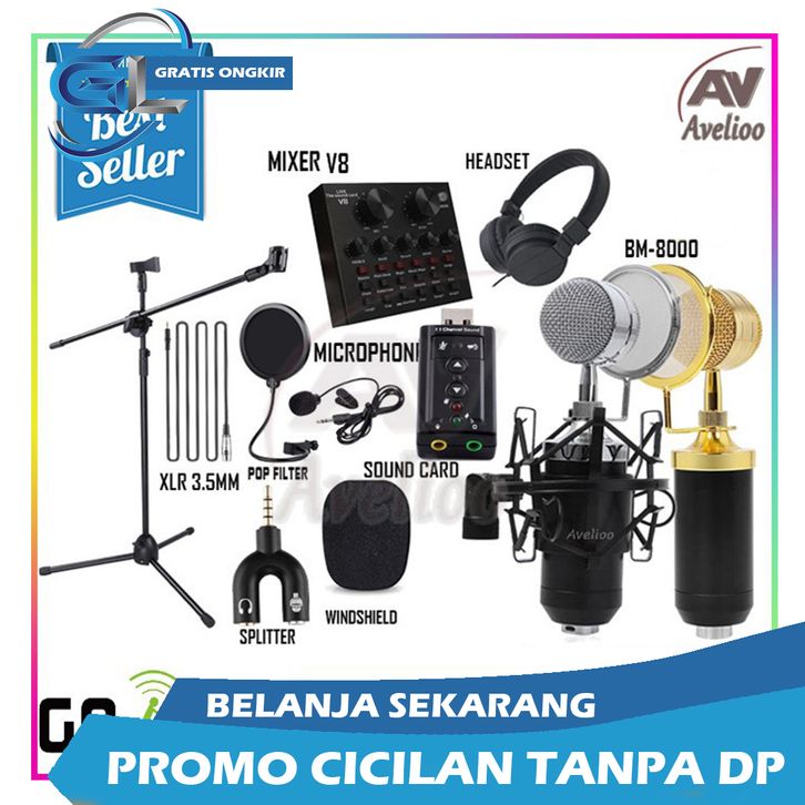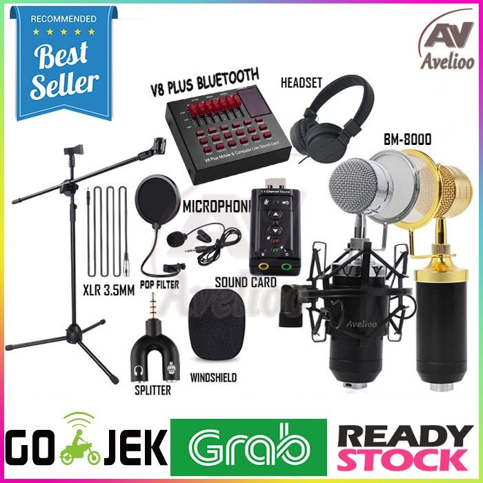 ONGKIR 0% PAKET KUMPLIT MIC CONDENSER BM 8000 + STAND LANTAI + SOUNDCARD V8 - BLACK V8