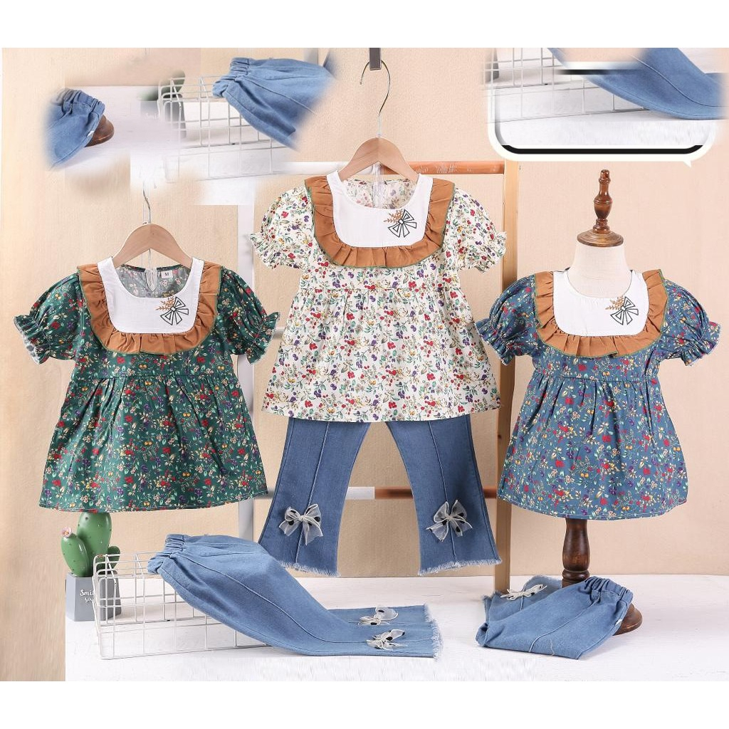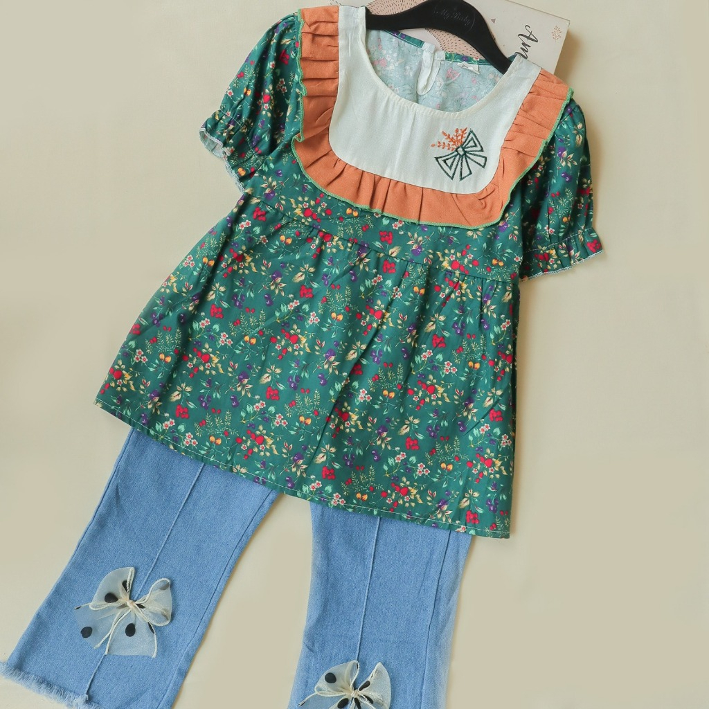 Setelan Baju Anak Perempuan Lengan Pendek Bahan Katun Jeans Casual Style Usia 1-4 Tahun