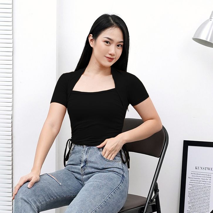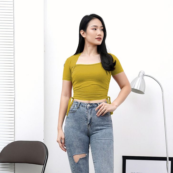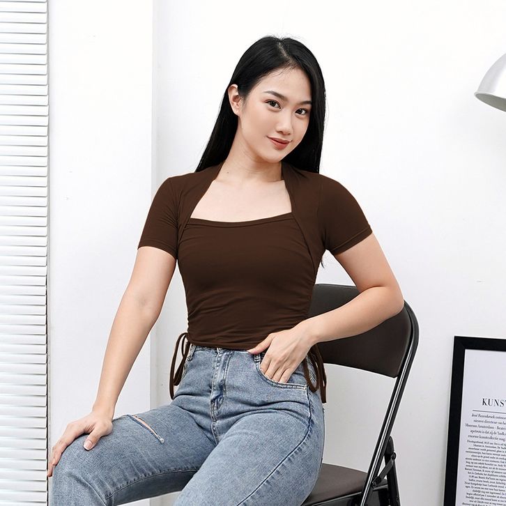 Crop Top Serut Lengan Pendek Wanita - Atasan Kaos Wanita Fashion Korea 6046