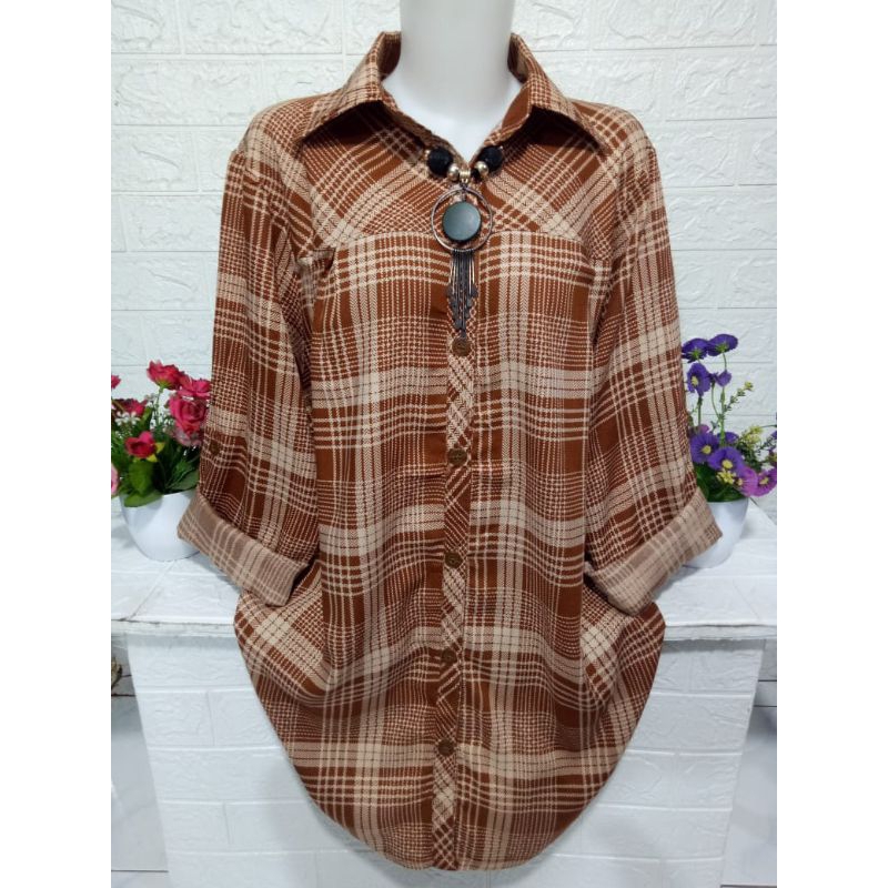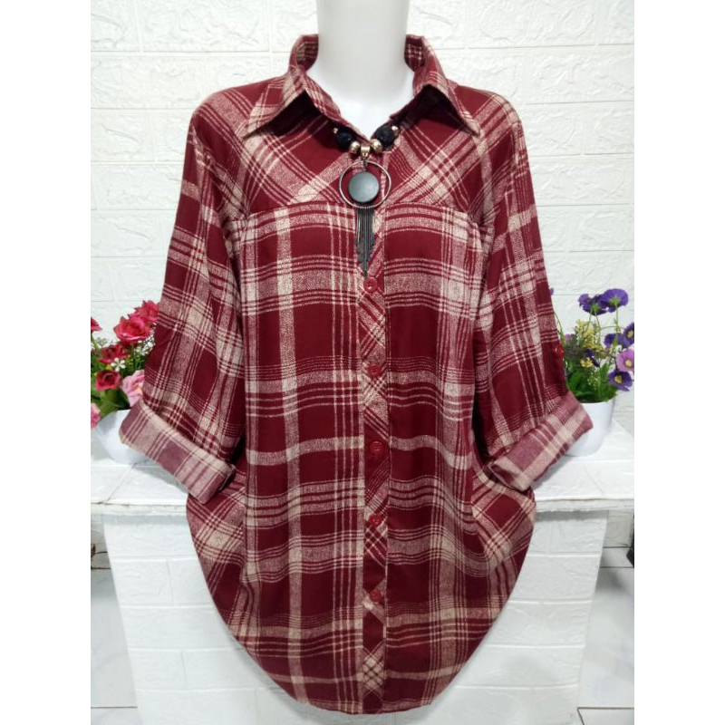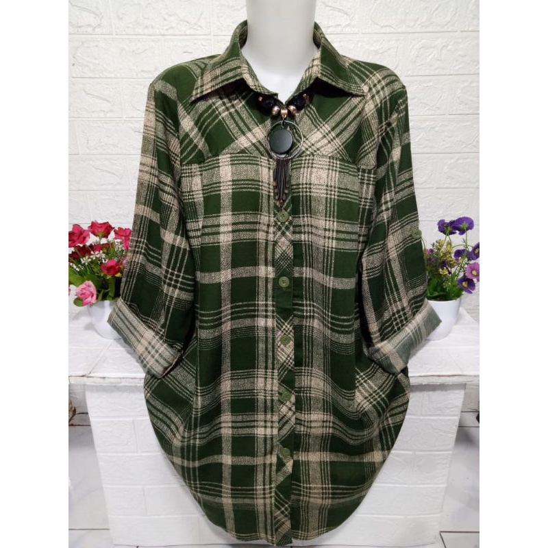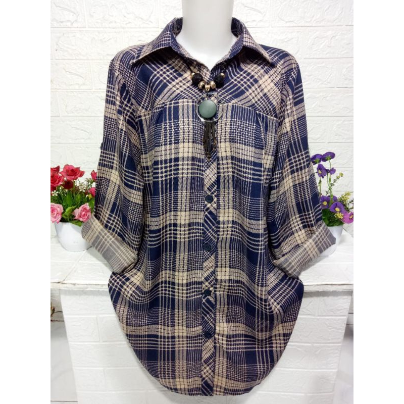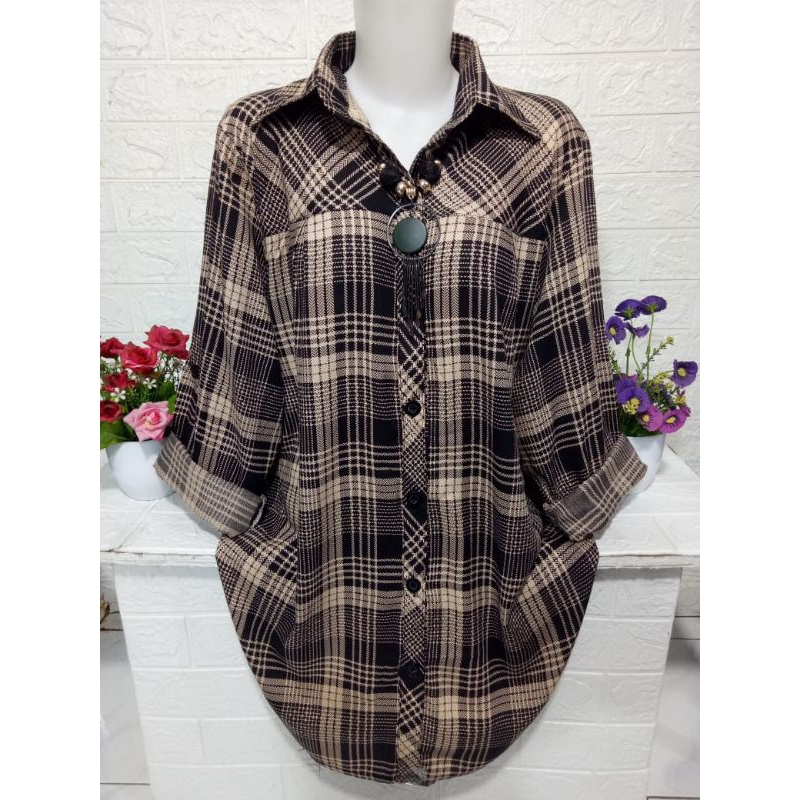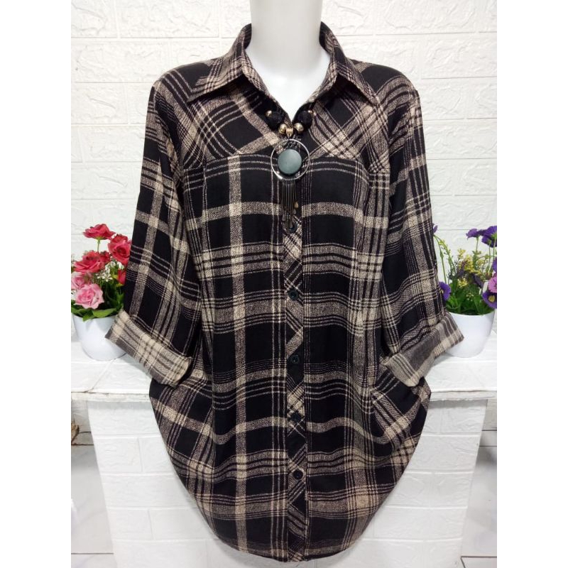 Baju cewek atasan kemeja wanita lengan panjang motif kotak kotak keren bahan rayon adem halus dan lembut R373