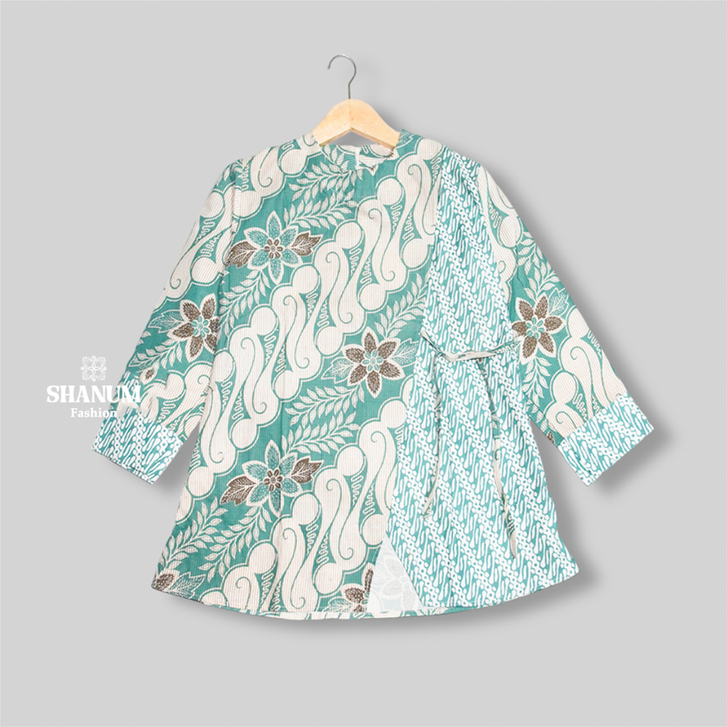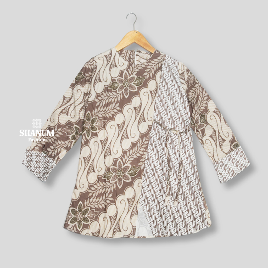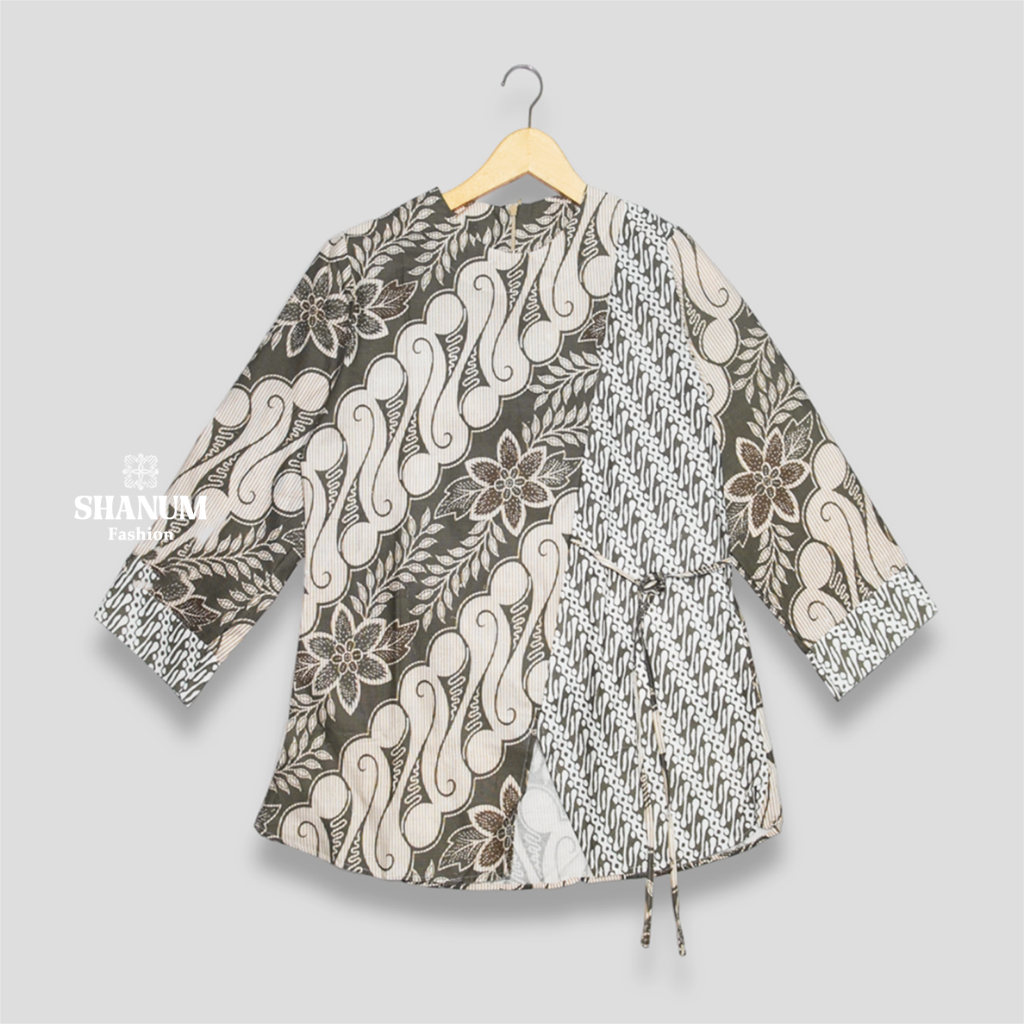 SHANUM Batik Wanita Modern Kerja Lengan 3/4 Kancing Depan Bahan Katun Premium Kombinasi Polos Blouse Monalisa Genes