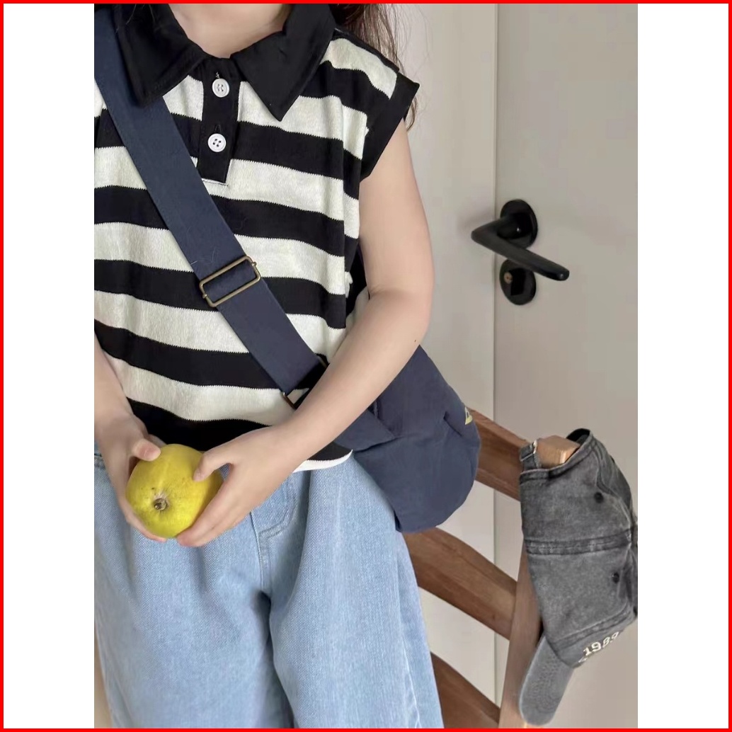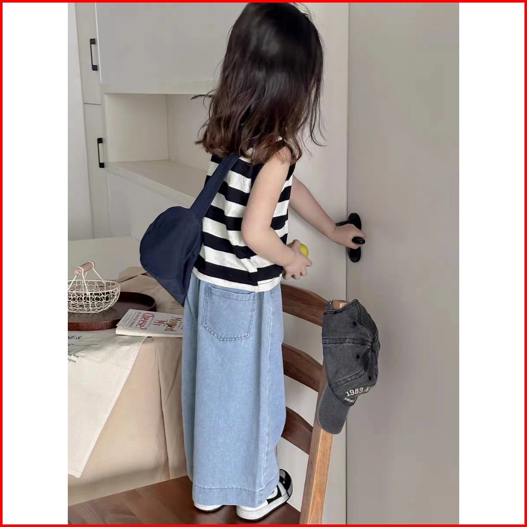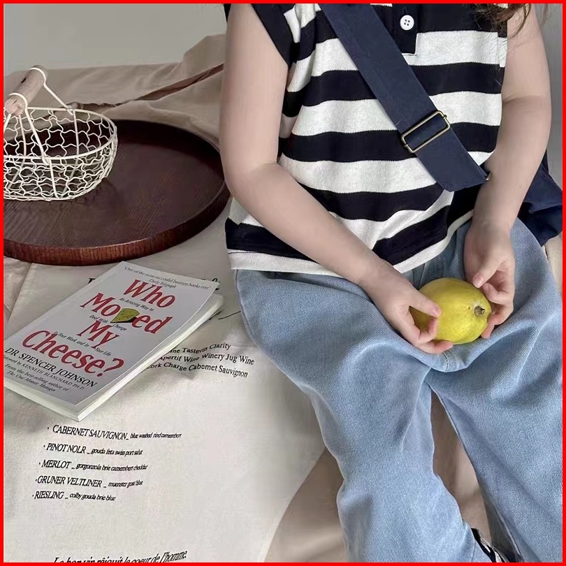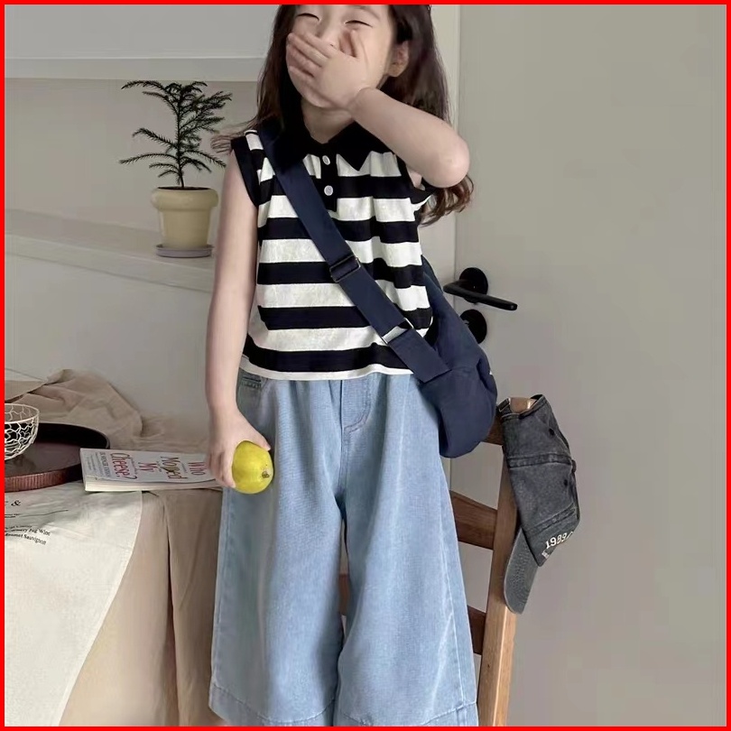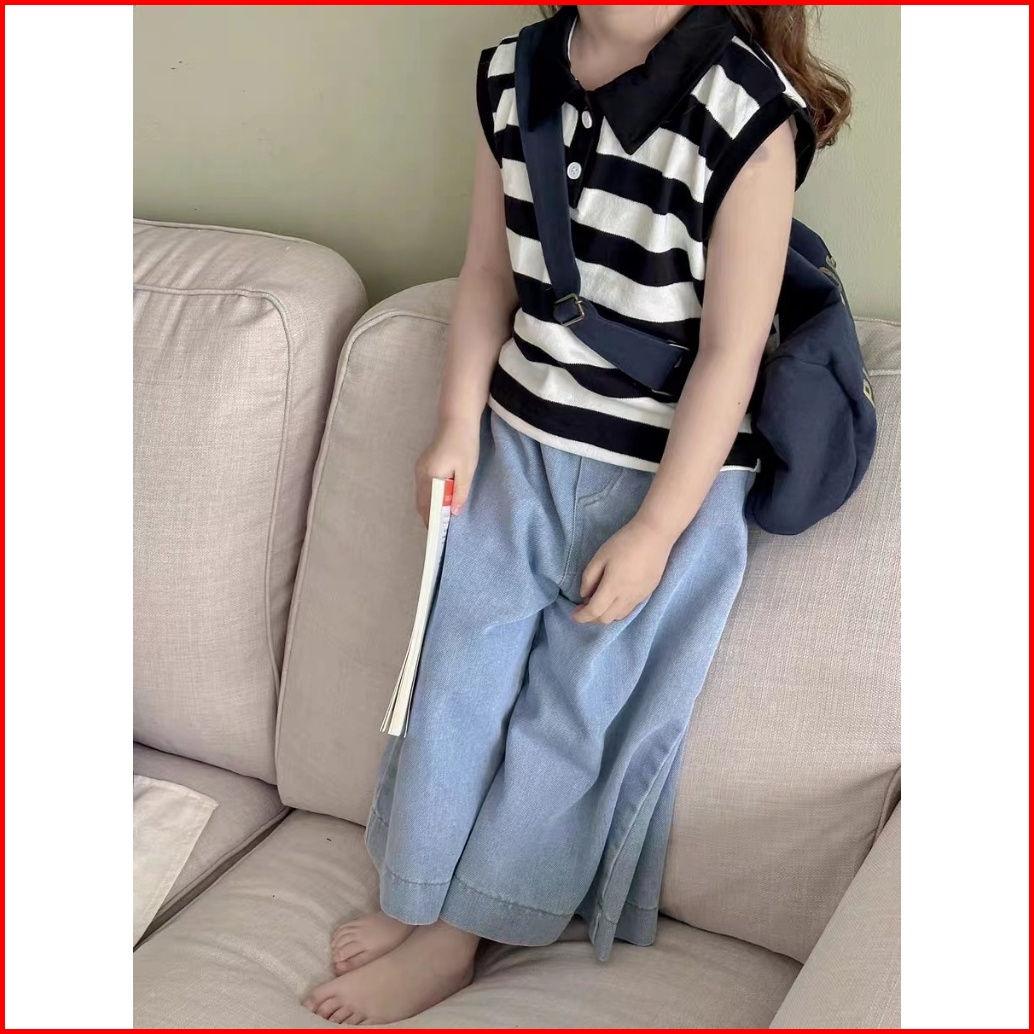 Makabaka Oneset Korean Style Setelan Anak Perempuan Polo Striped T-shirt Tanpa Lengan Celana Jeans Panjang Baju Anak Sty
