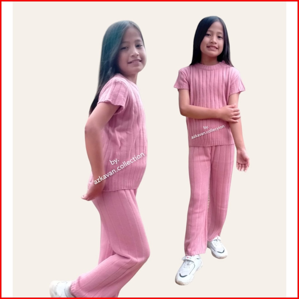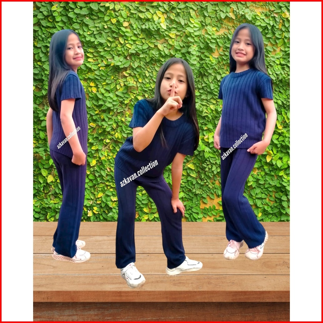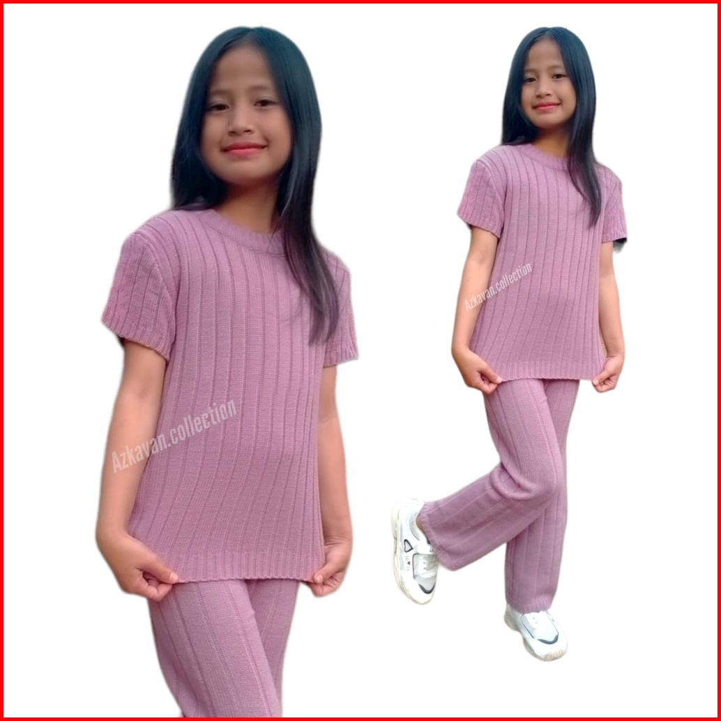 One Set Blouse Salur Tangan Pendek Vs Celana Kulot Rajut Anak Umur 4-7-8-9-10-12 Tahun Pakaian Anak Perempuan