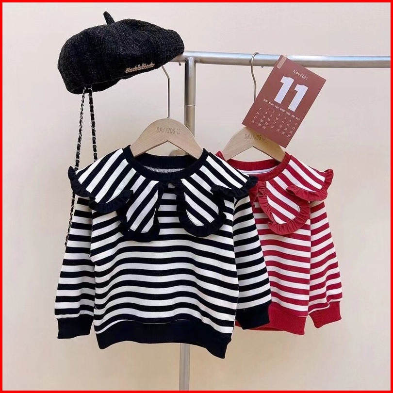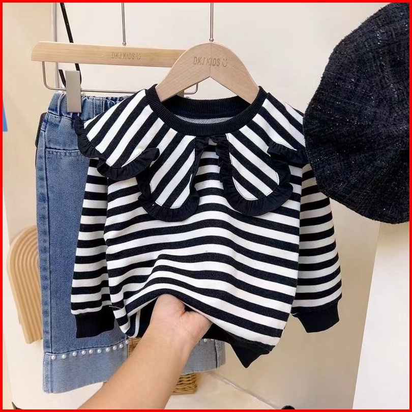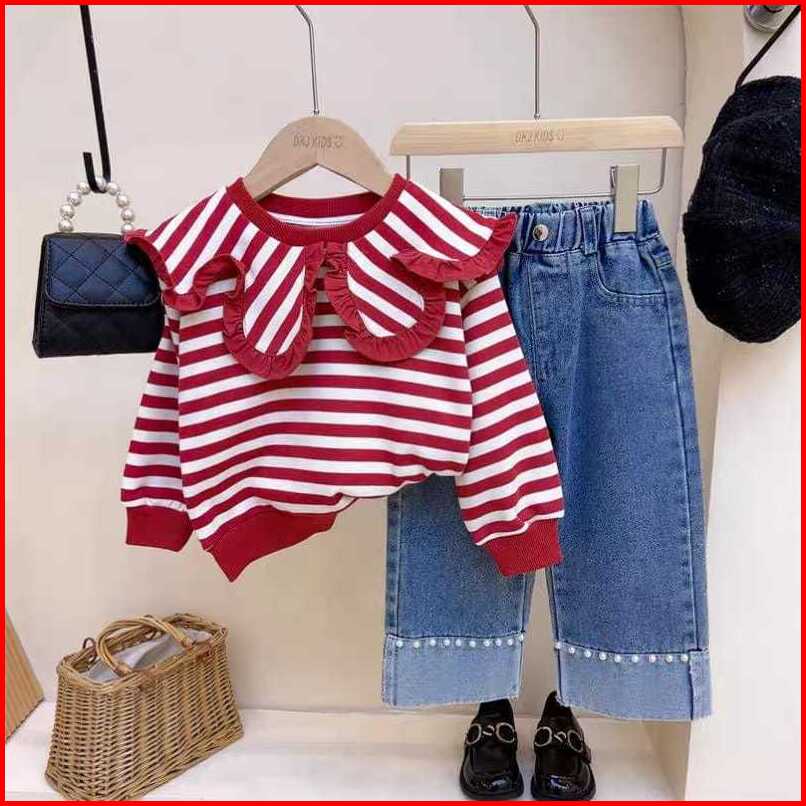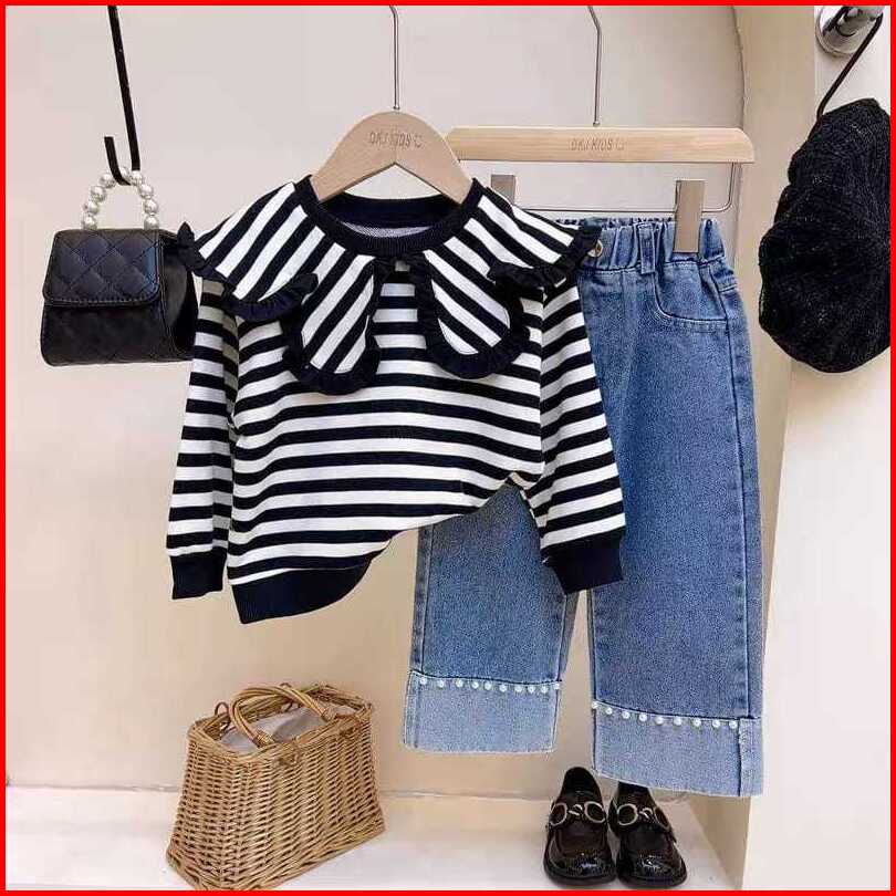 Kidsfo-99 Setelan Set Anak Besar Remaja Abg Cewek Perempuan Sweater Garis Korea Celana Panjang Jeans Mutiara