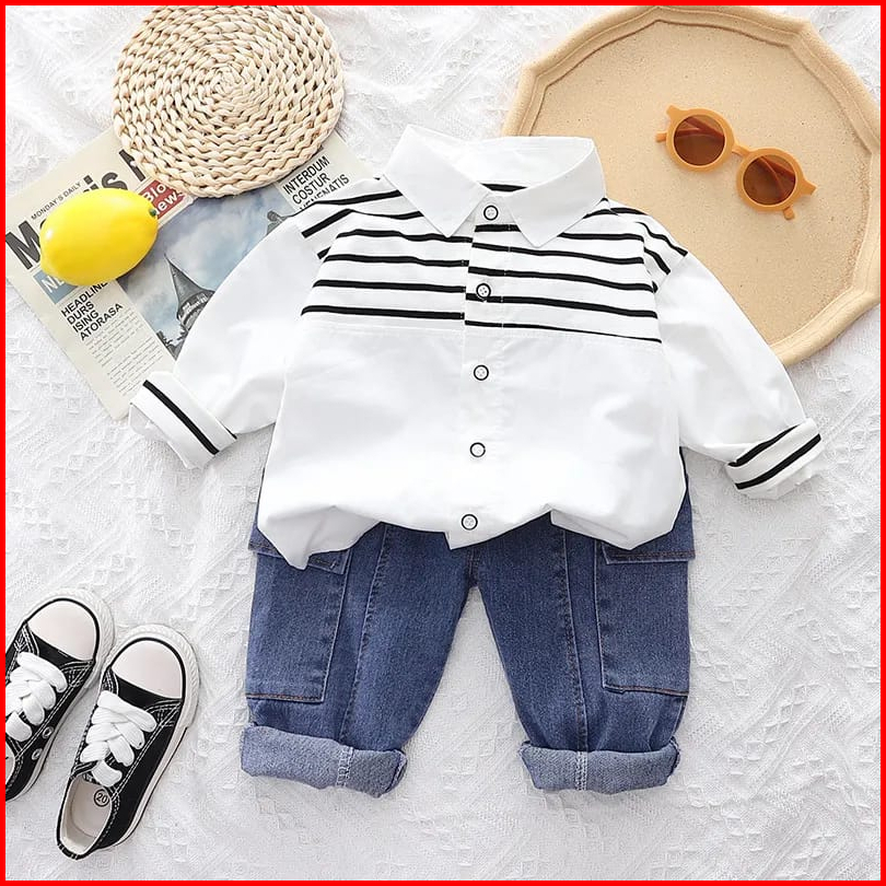Brownieground Setelan Lengan Panjang Anak Laki Laki 6 Bulan - 5 Tahun Motif Garis Hitam Putih Baju Bayi Ala Korea Premiu