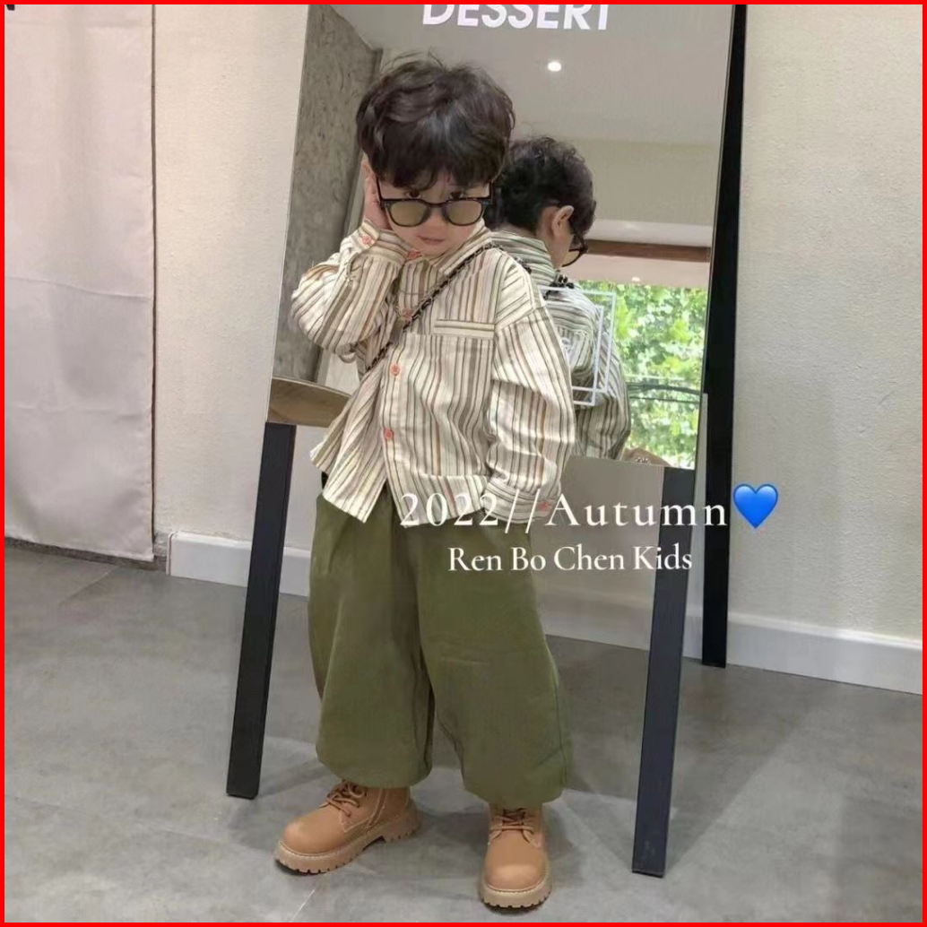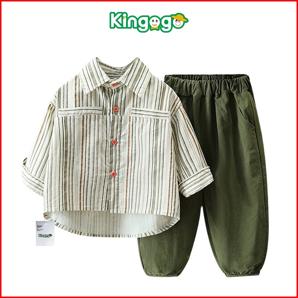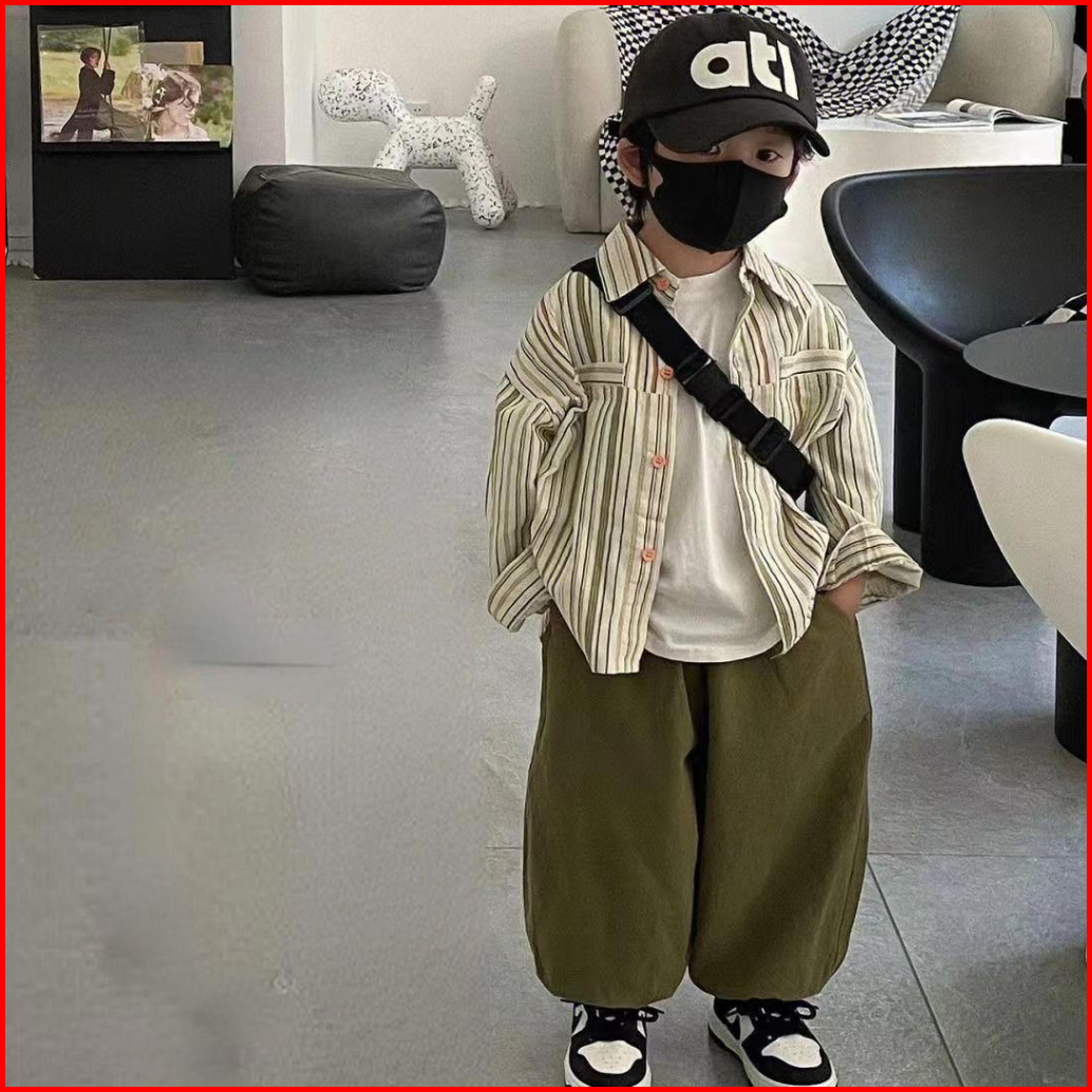 Kingogo Korean Style Anak Laki-laki Garis-garis Kemeja Celana Panjang Wide Leg Pants Set Anak Fahion Baju Laki-laki