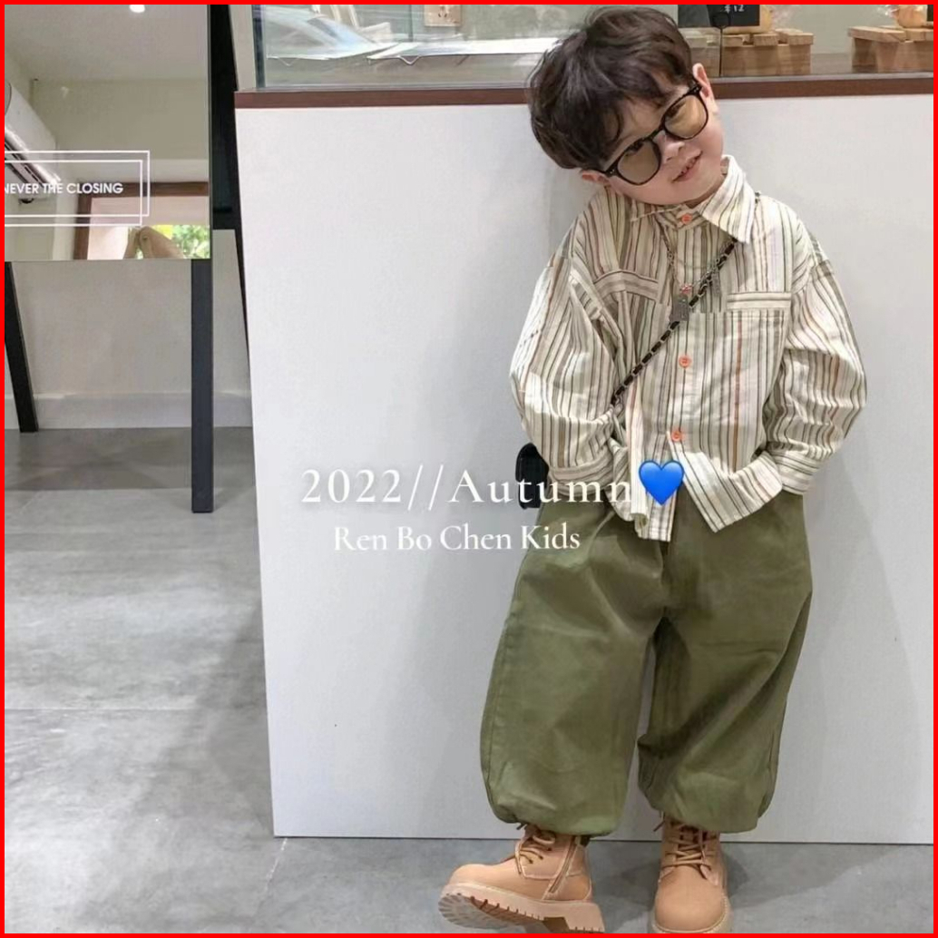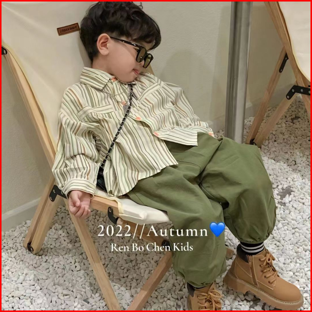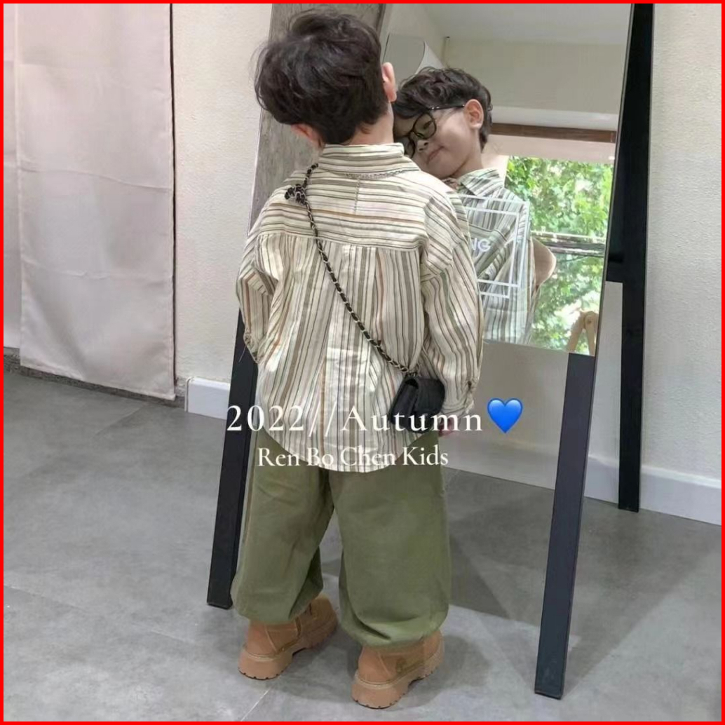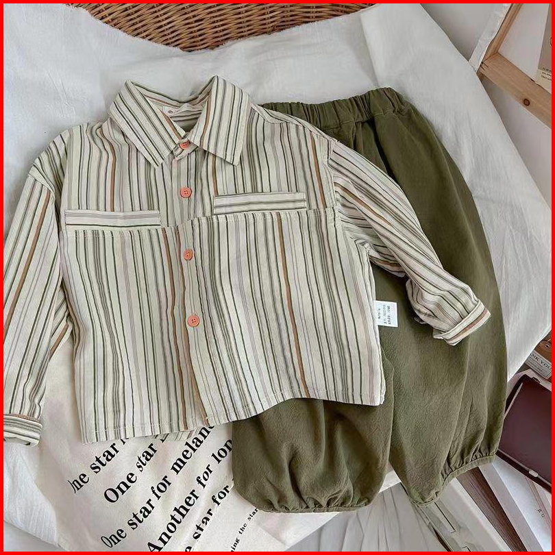 Kingogo Korean Style Anak Laki-laki Garis-garis Kemeja Celana Panjang Wide Leg Pants Set Anak Fahion Baju Laki-laki