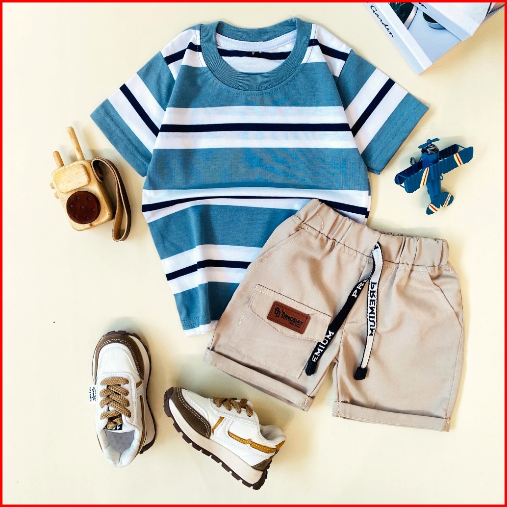 Estishop X Dinoday Setelan Anak Laki Laki Baju Kaos Salur Stripe Celana Cargo Saku Hotpants 1-7 Tahun