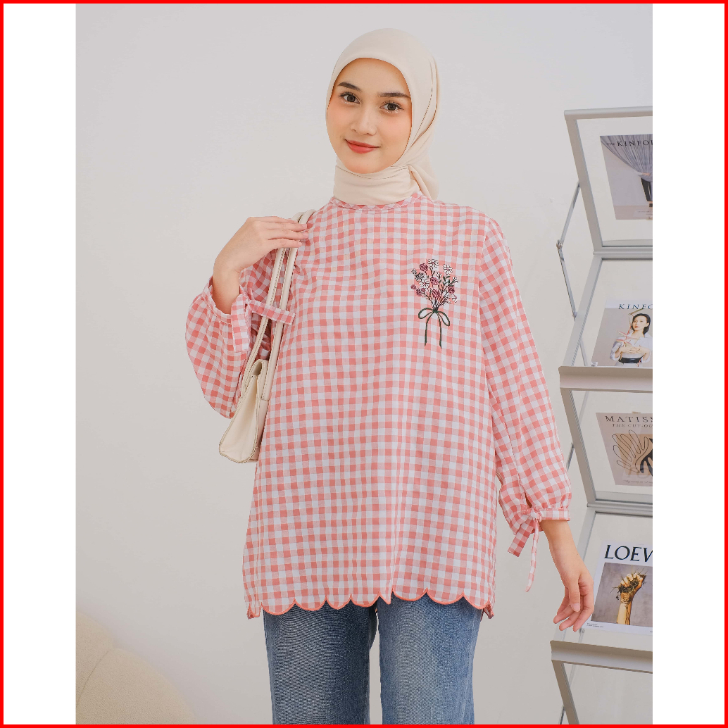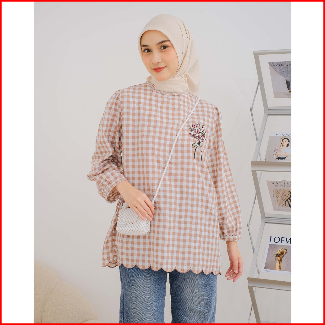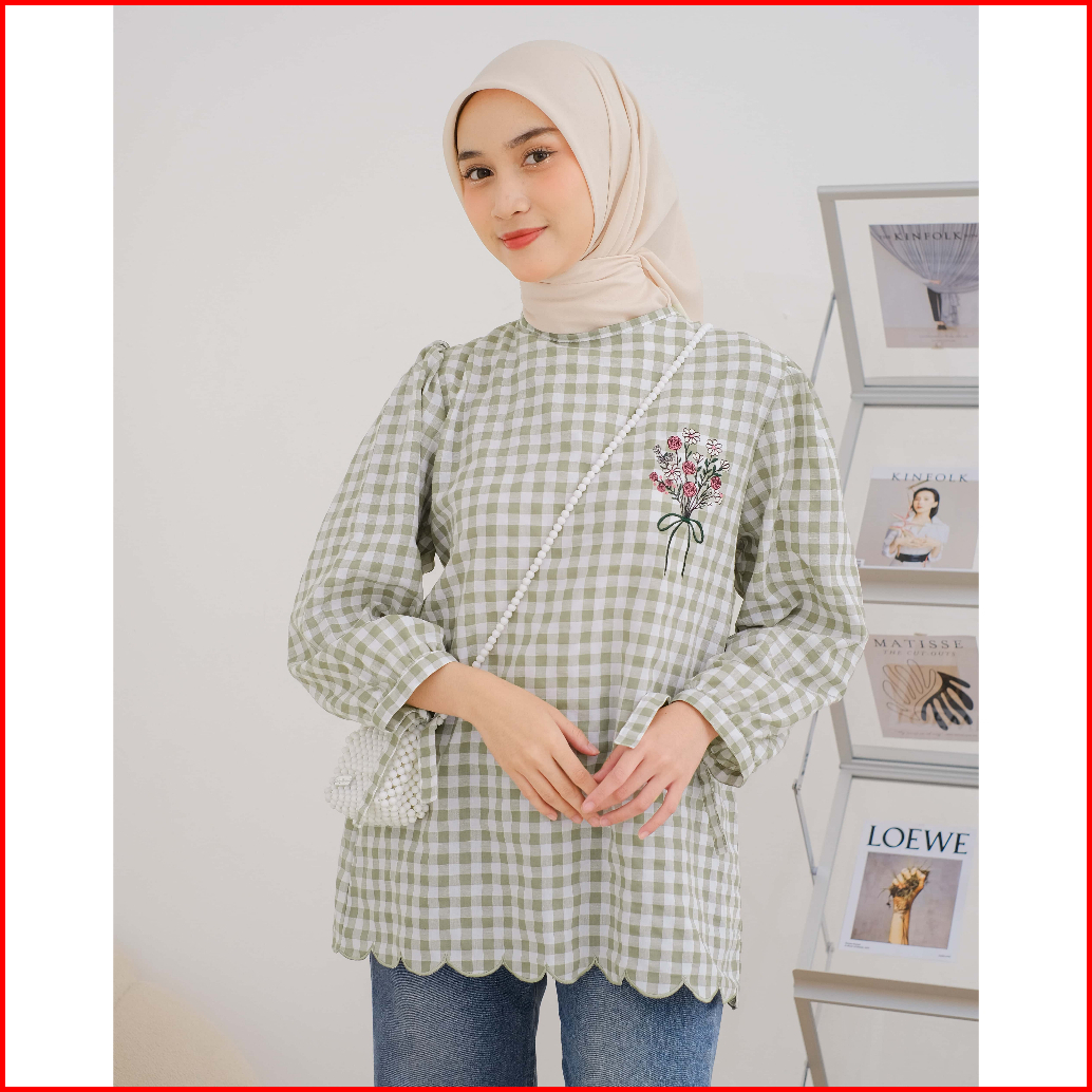 Mayoutfit Alora Blouse Blus Gingham Bordir Bunga Lengan Puff Variasi Tali