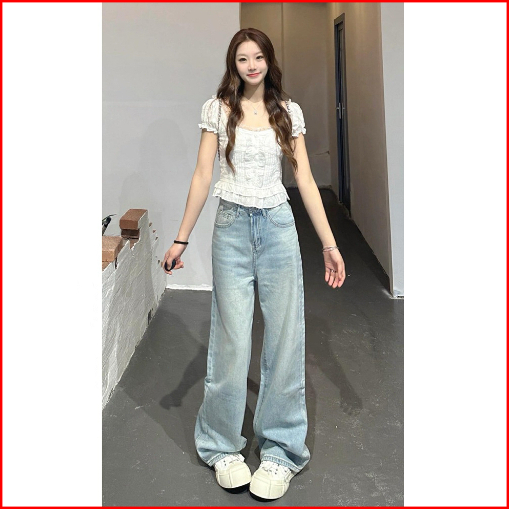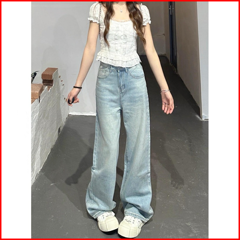 Korean Style Retro Celana Jeans Panjang Wanita Highwaist Causual Baggy Straight Wide Leg Jeans Import Street Style Denim