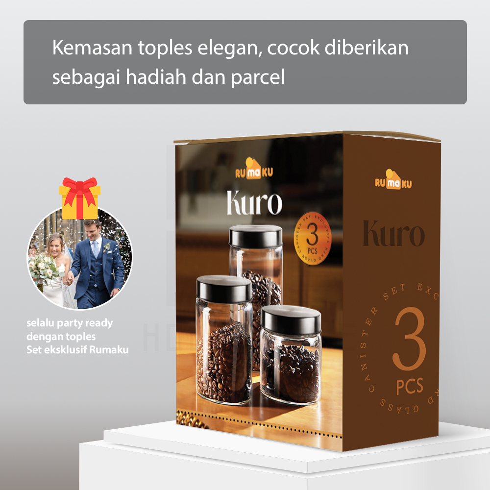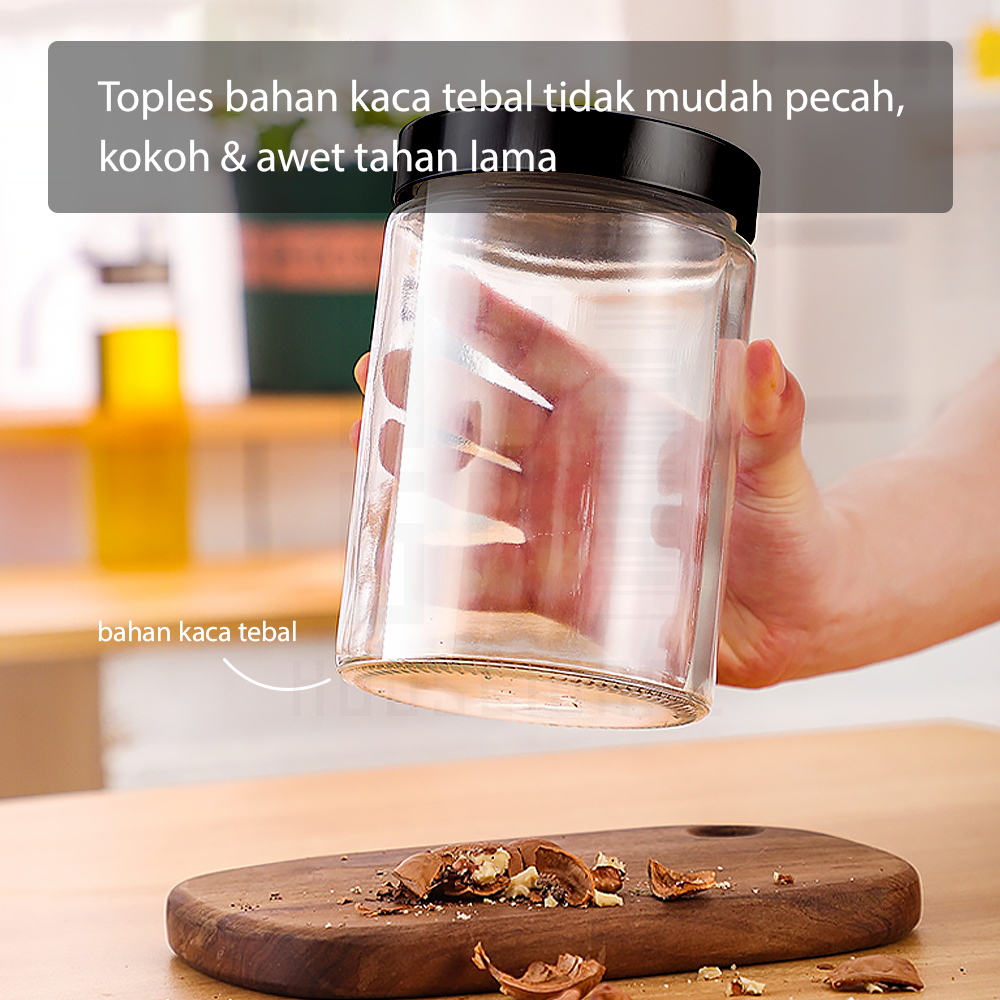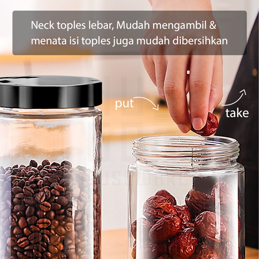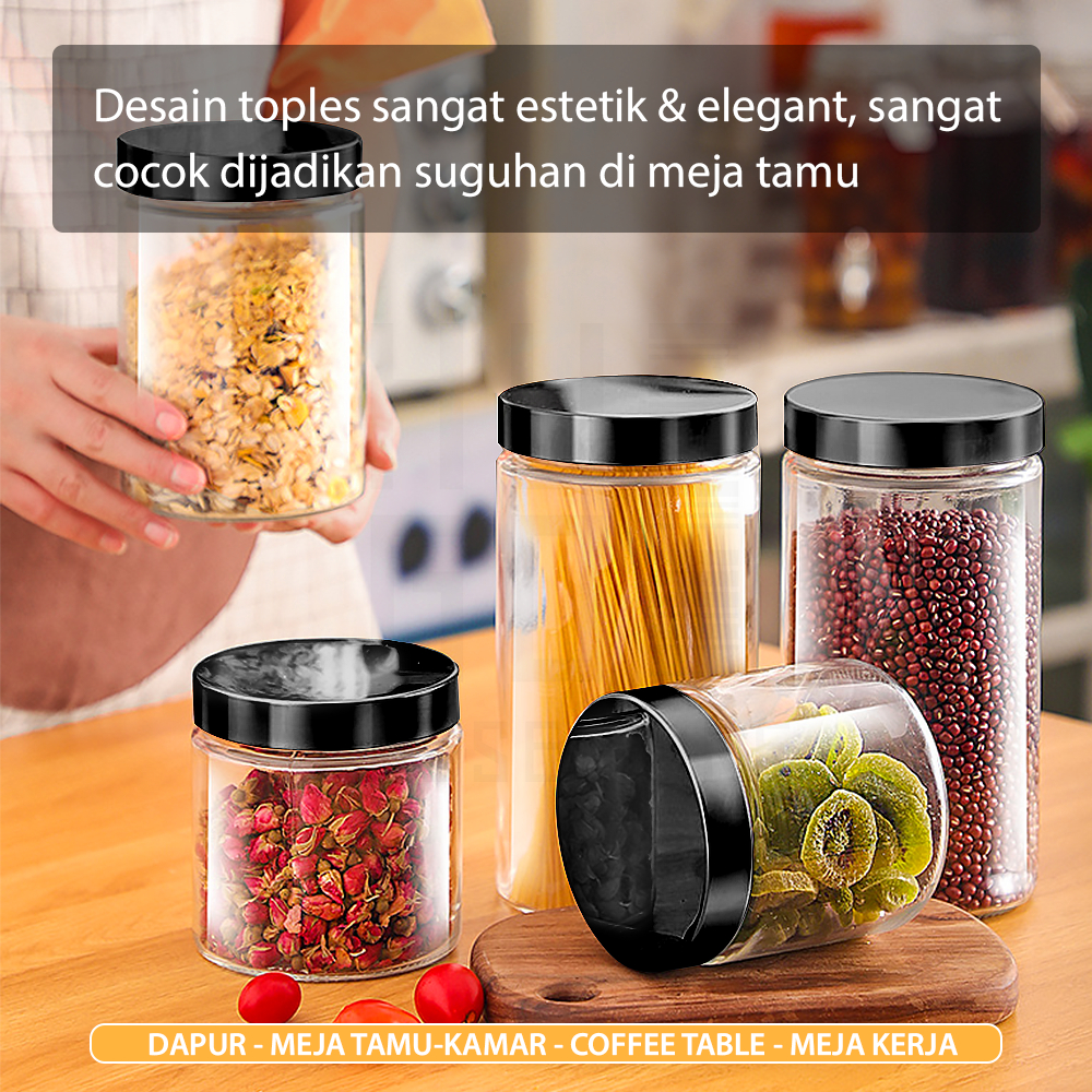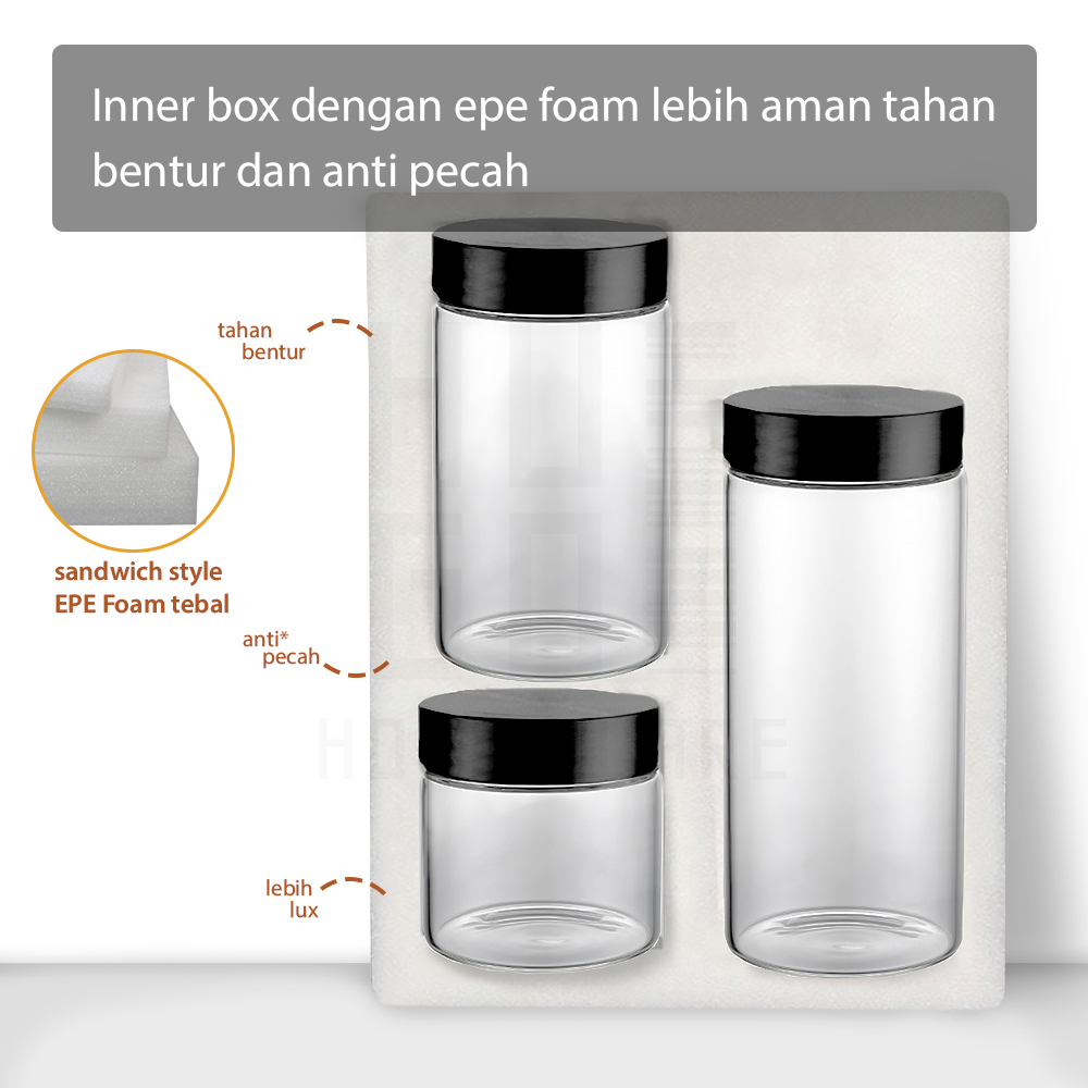 HUGO Toples Kaca Set 3 Pcs Toples Kue Kerupuk Kedap Udara Polos Tutup Warna Hitam Premium Quality / HUGO OFFICIAL