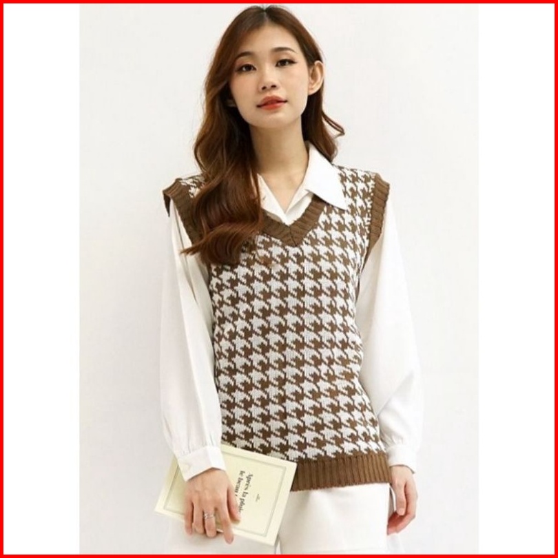 Rompi Rajut Wanita Motif Houndstooth Vneck Korean Style