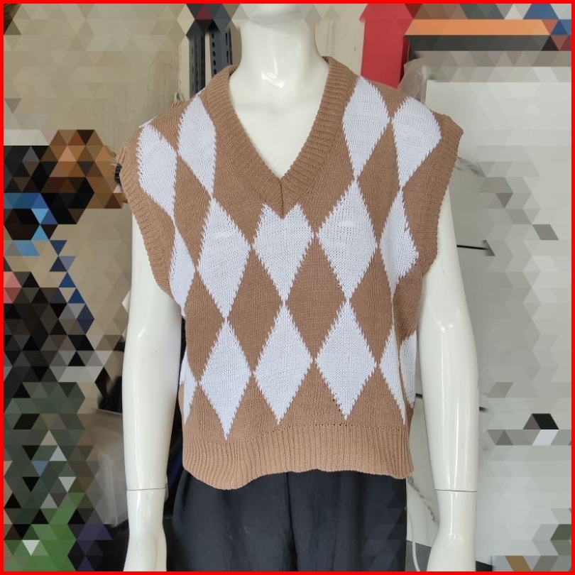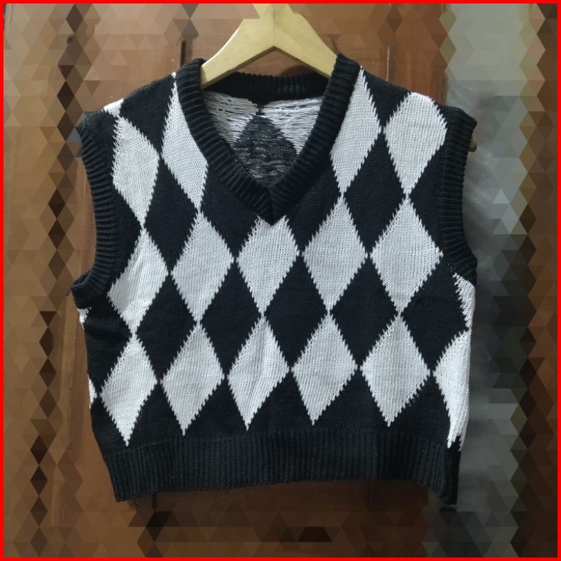 Vest Rajut Crop Argyle Motif Ketupat Rompi Rajut Wanita Crop Korean Style Outer Crop