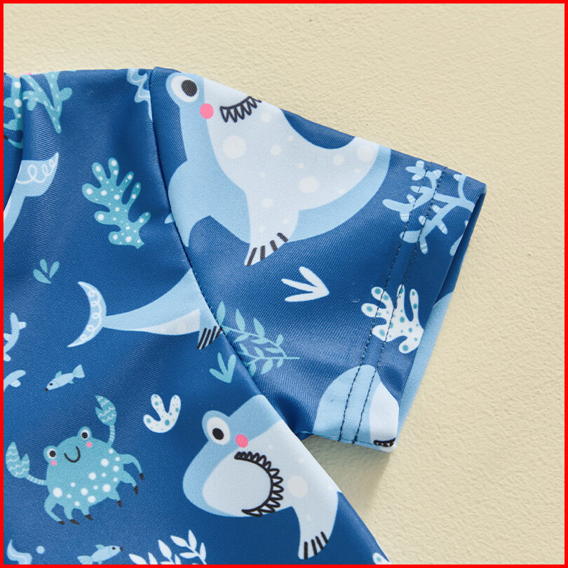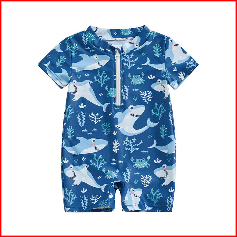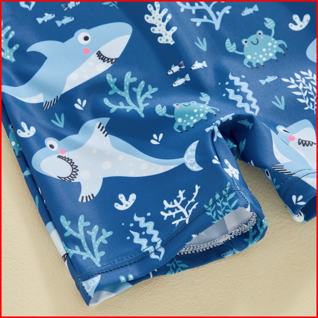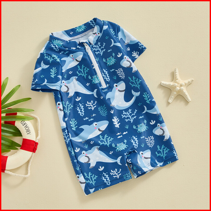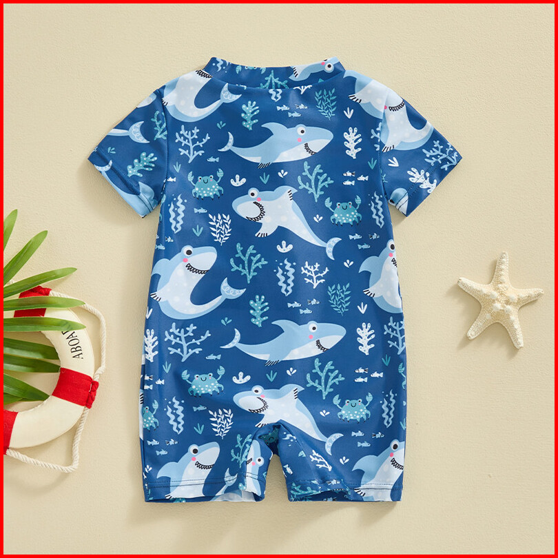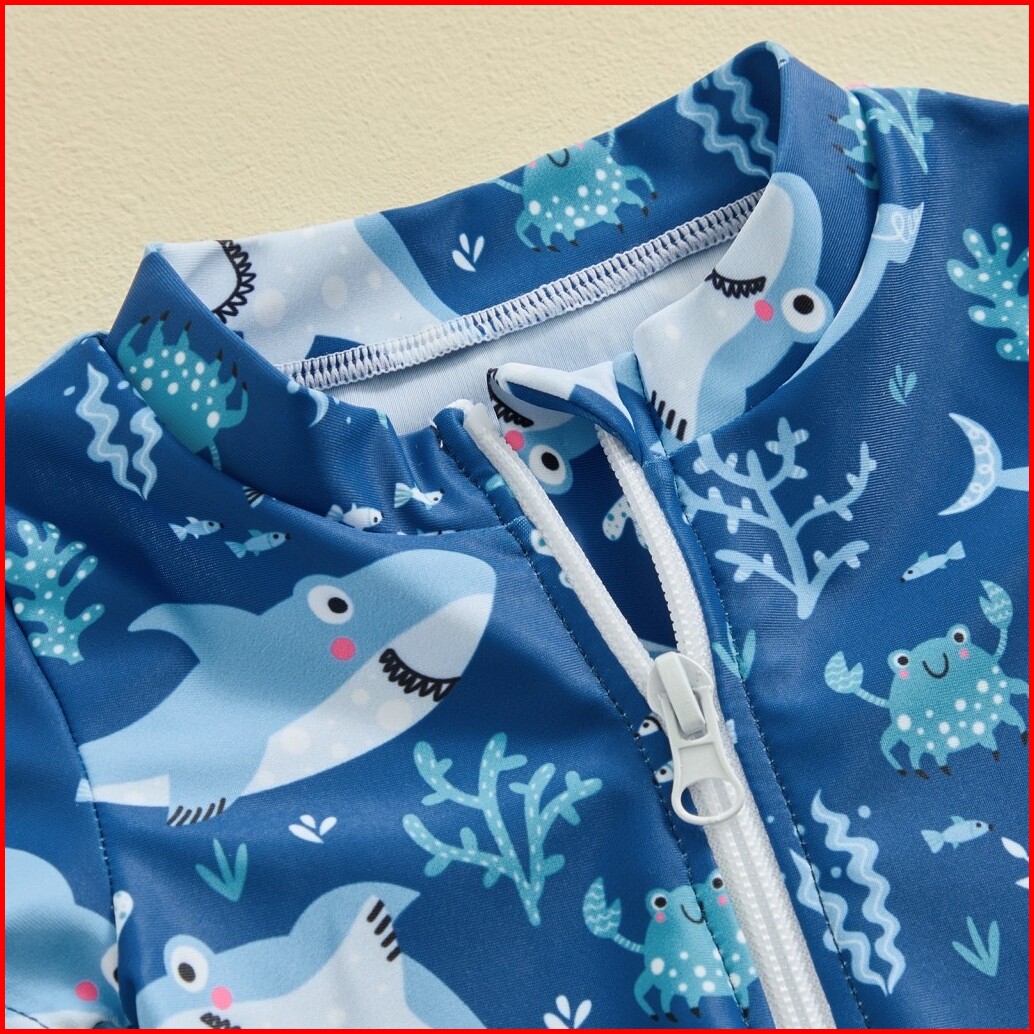 Baju Renang Pelindung Matahari Balita Laki-laki Lengan Pendek Crewneck Pakaian Renang Ritsleting Gambar Hewan Laut