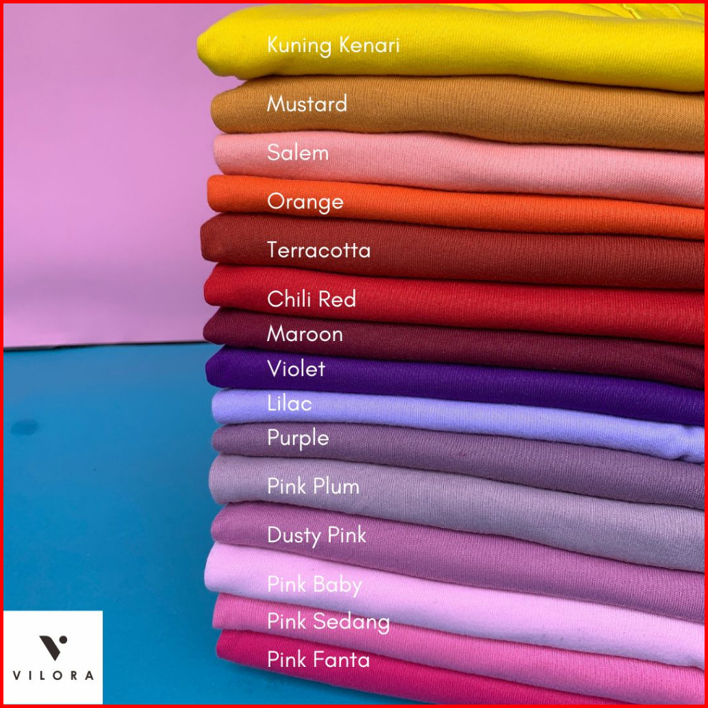 Hitam, Putih, Cokelat Pamuka, Mocca Tua, Mocca, Coksu, Earth, Rosy Brown, Cream, Grey, Grey Police, Abu Tua, Navy, Soft Denim, Denim, Wardah, Benhur, Purple, Lilac, Matcha, Dusty Pink, Pink Plum, Maroon, Salem, Terracotta, Orange, Kuning Kenari, Army, Hijau Pandan, Tosca Muda, Pink Sedang, Pink Fanta, Tosca Tua, Mustard, Blue Sea, Khaki, Violet, Dark Mauve, Pink Baby, Chili Red, Hijau Tua, Turkish Baby, Turkish Sedang